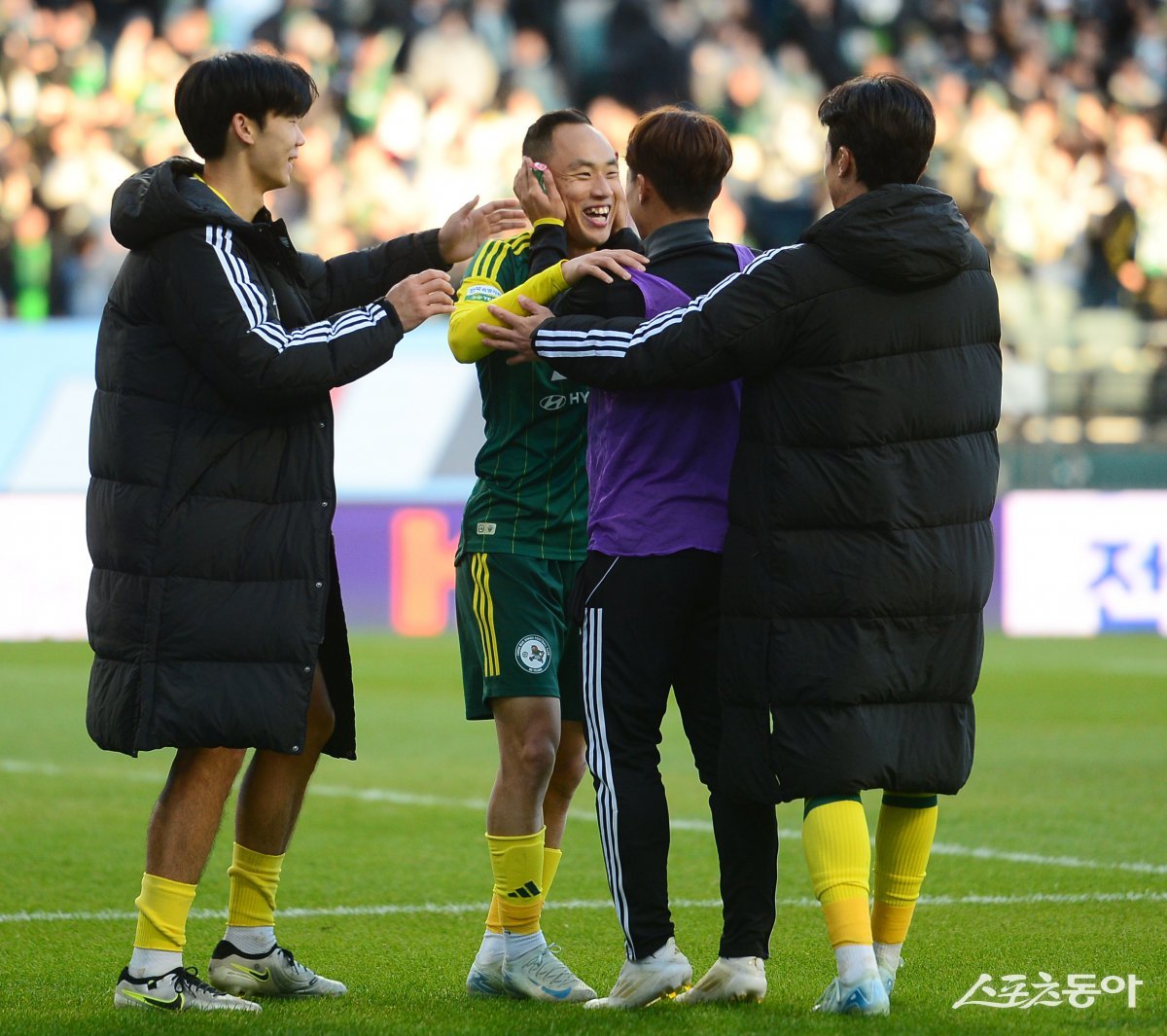 8일 전주월드컵경기장에서 열린 ‘하나은행 K리그 2024’ 승강 플레이오프 2차전 전북 현대모터스와 서울 이랜드의 경기에서 추가골을 성공시킨 전북 문선민이 동료들과 기쁨을 나누고 있다. 전주 | 주현희 기자 teth1147@donga.com
