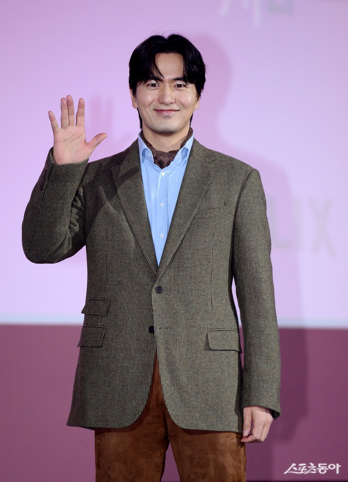 9일 서울 중구 동대문디자인플라자(DDP)에서 열린 넷플릭스 ‘오징어 게임’ 시즌2 제작발표회에 참석한 이진욱이 카메라를 향해 포즈를 취하고 있다. 김민성 기자 marineboy@donga.com