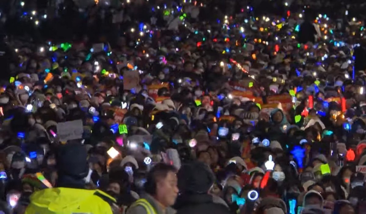 촛불집회 행렬에 케이팝 팬덤의 상징인 ‘응원봉’ 물결이 펼쳐지고 있다. 사진출처|MBC 뉴스 영상 캡처