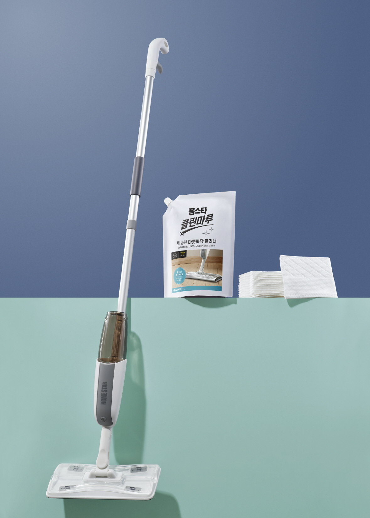 원스톱 바닥청소 솔루션으로, ‘뽀송한 마룻바닥클리너’, ‘도톰한 3겹 바닥청소패드’, ‘촉촉한 이지클린 스프레이밀대’ 등 3종으로 구성했다. 클리너 용액을 스프레이밀대에 담고, 바닥청소패드를 밀대 끝에 부착한다. 이어 일반 밀대처럼 바닥을 쓱쓱 밀면서 청소하면 된다.