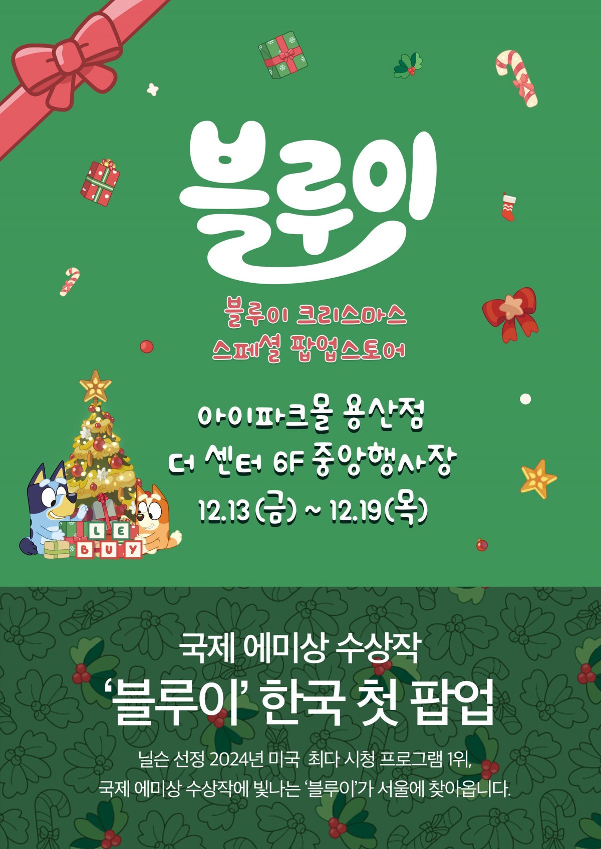 HDC아이파크몰 용산점이 13~19일 6층 더 센터에서 ‘블루이 크리스마스 스페셜 팝업스토어’(사진)를 운영한다.