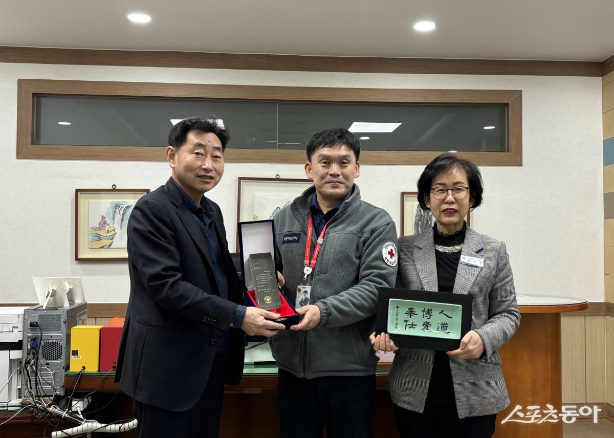 대한적십자사 관계자가 영주시보건소에 헌혈 유공패를 전달하고 있다./사진=영주시