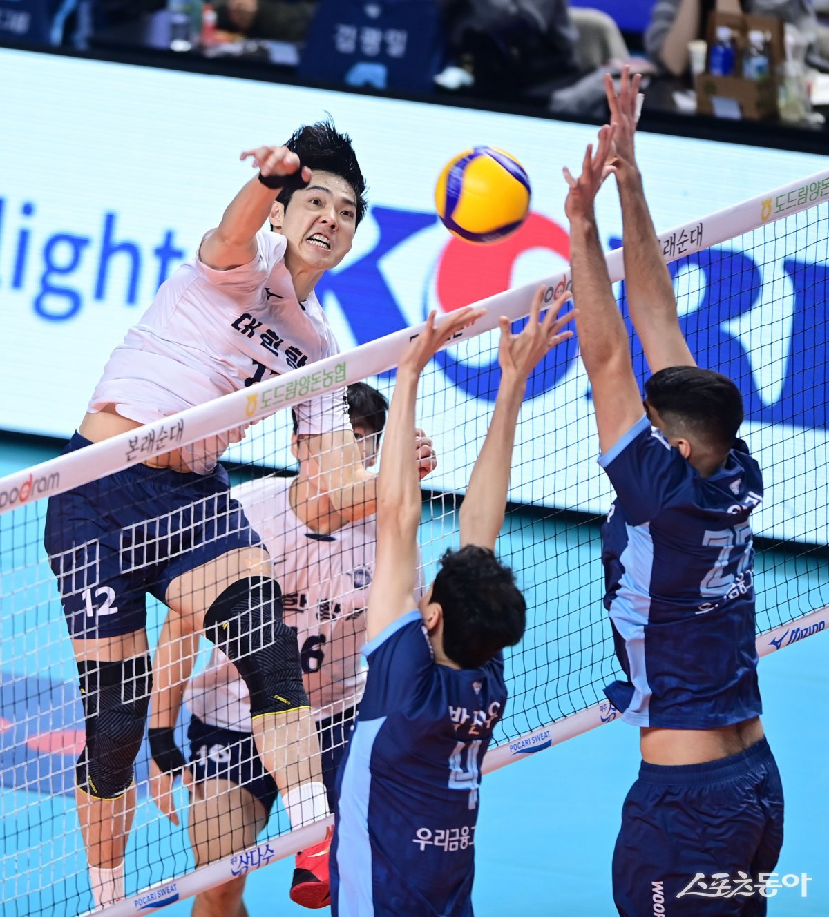 12일 서울 장충체육관에서 열린 ‘도드람 2024-2025 V리그’ 남자부 서울 우리카드와 인천 대한항공의 경기에서 대한항공 조재영이 우리카드 블로커 앞에서 스파이크를 하고 있다. 장충 | 주현희 기자 teth1147@donga.com