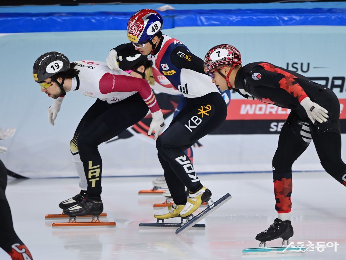 15일 서울 목동동합운동장 목동아이스링크에서 열린 ‘KB금융-ISU 쇼트트랙 월드투어 서울 대회’ 남자 1000m 준결승전 경기에서 한국 쇼트트랙 대표팀 김태성이 캐나다 선수와 충돌하고 있다. 목동 | 주현희 기자 teth1147@donga.com