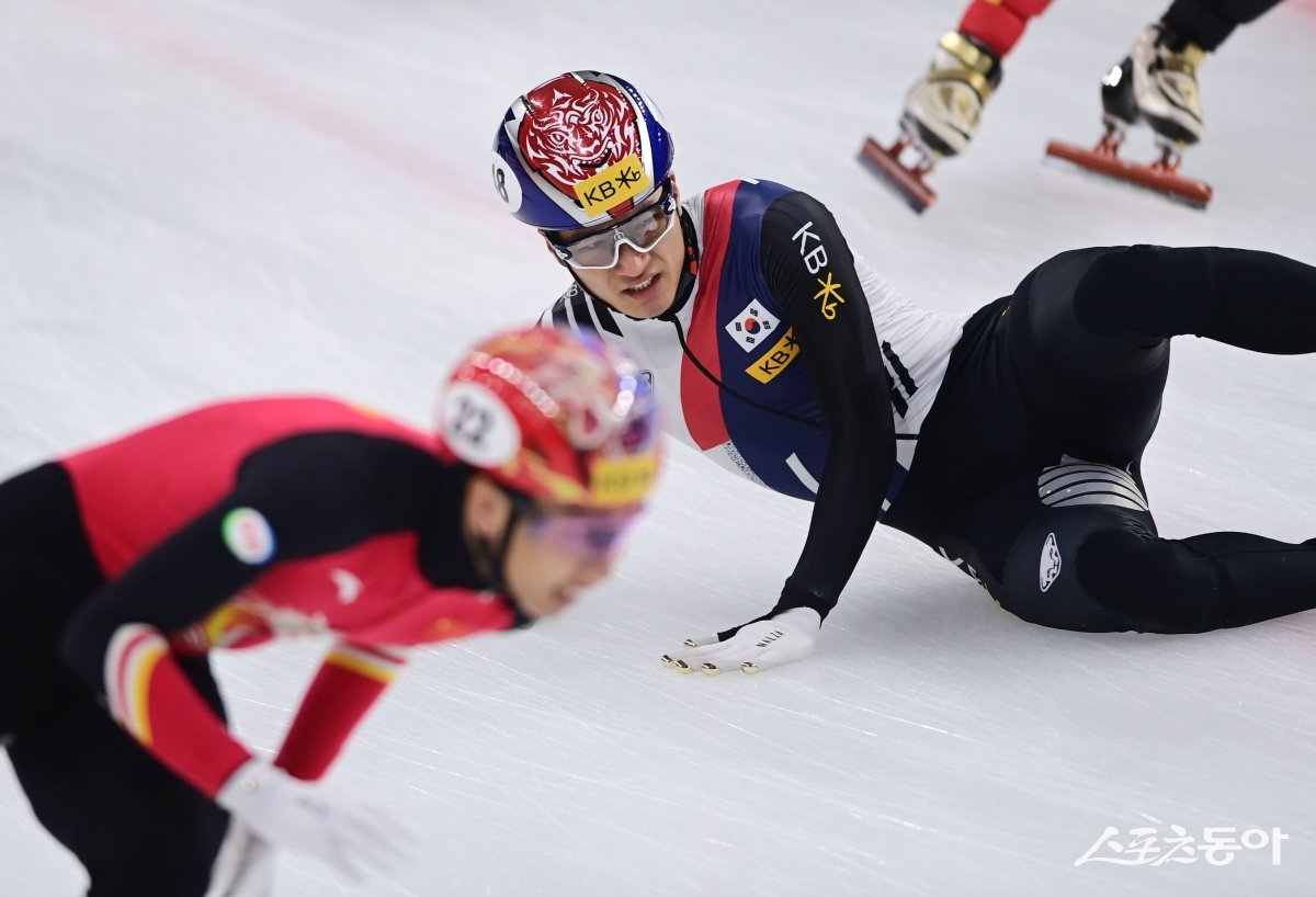 15일 서울 목동동합운동장 목동아이스링크에서 열린 ‘KB금융-ISU 쇼트트랙 월드투어 서울 대회’ 남자 계주 5000m 결승전 경기에서 한국 쇼트트랙 대표팀 김태성이 터치 과정에서 넘어지고 있다. 목동 | 주현희 기자 teth1147@donga.com