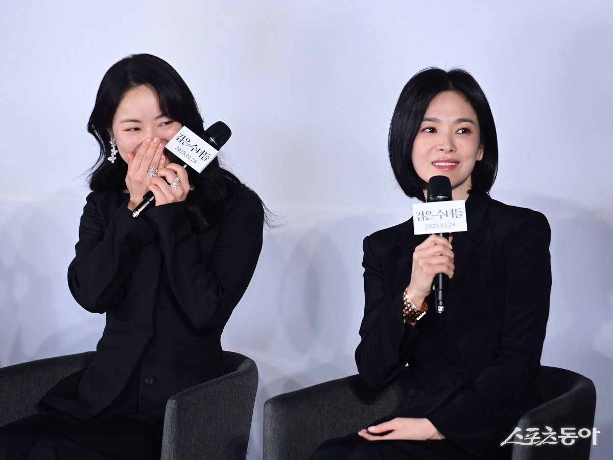 배우 전여빈이 16일 서울 용산구 CGV용산아이파크몰점에서 열린 영화 ‘검은 수녀들’ 제작보고회에서 송혜교의 답변에 입을 가리며 웃고 있다. 주현희 기자 teth1147@donga.com