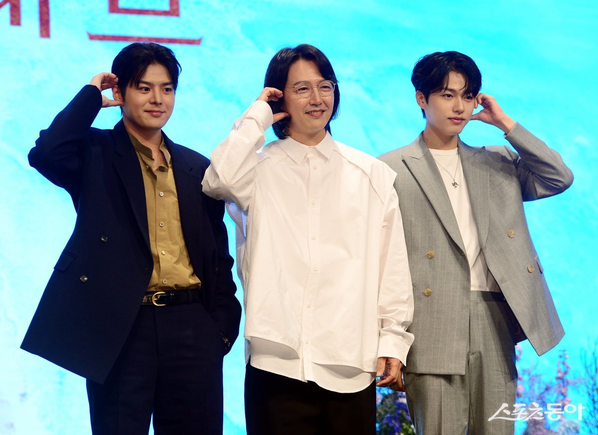16일 서울 구로구 더세인트에서 열린 지니 TV 오리지널 드라마 ‘나미브’ 제작발표회에 참석한 려운, 윤상현, 이진우가 카메라를 향해 포즈를 취하고 있다. 고현정은 이날 건강 악화로 불참했다. 김민성 기자 marineboy@donga.com
