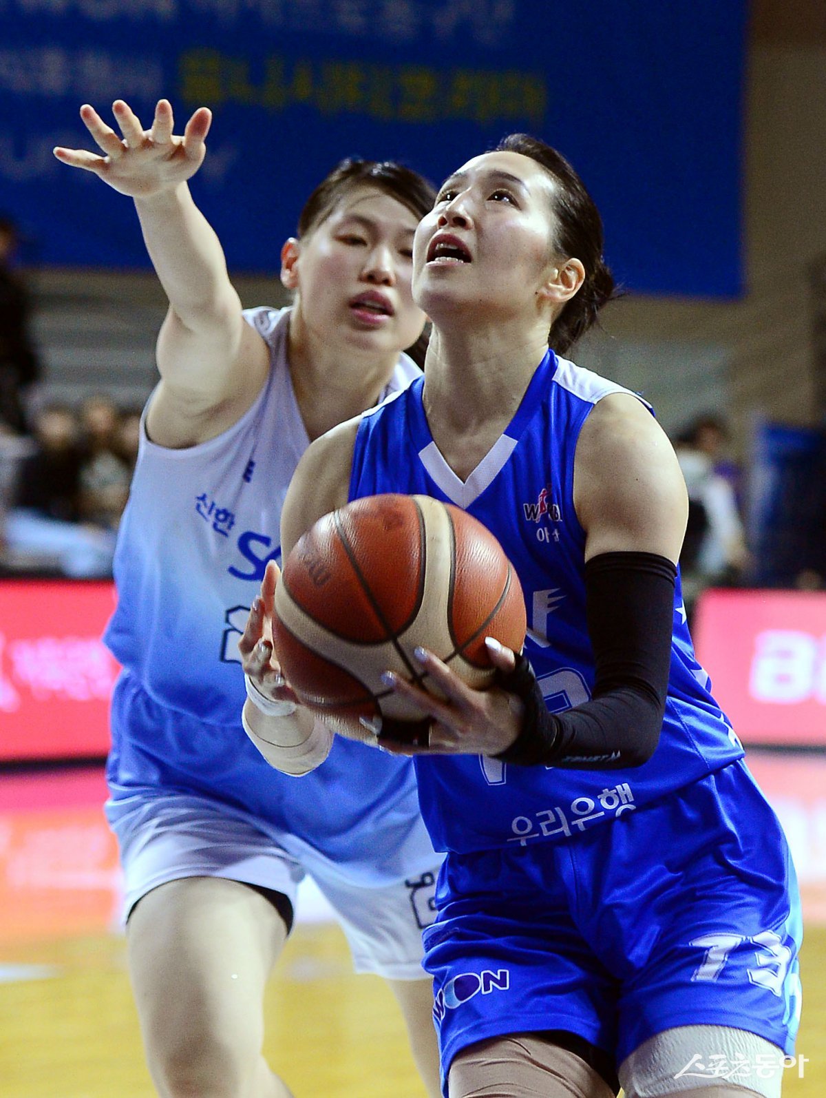 16일 충남 아산 이순신체육관에서 열린 ‘하나은행 2024-2025 여자프로농구’ 아산 우리은행과 인천 신한은행의 경기에서 우리은행 모모나가 신한은행 수비를 피해 슛을 쏘고 있다. 아산 | 김민성 기자 marineboy@donga.com