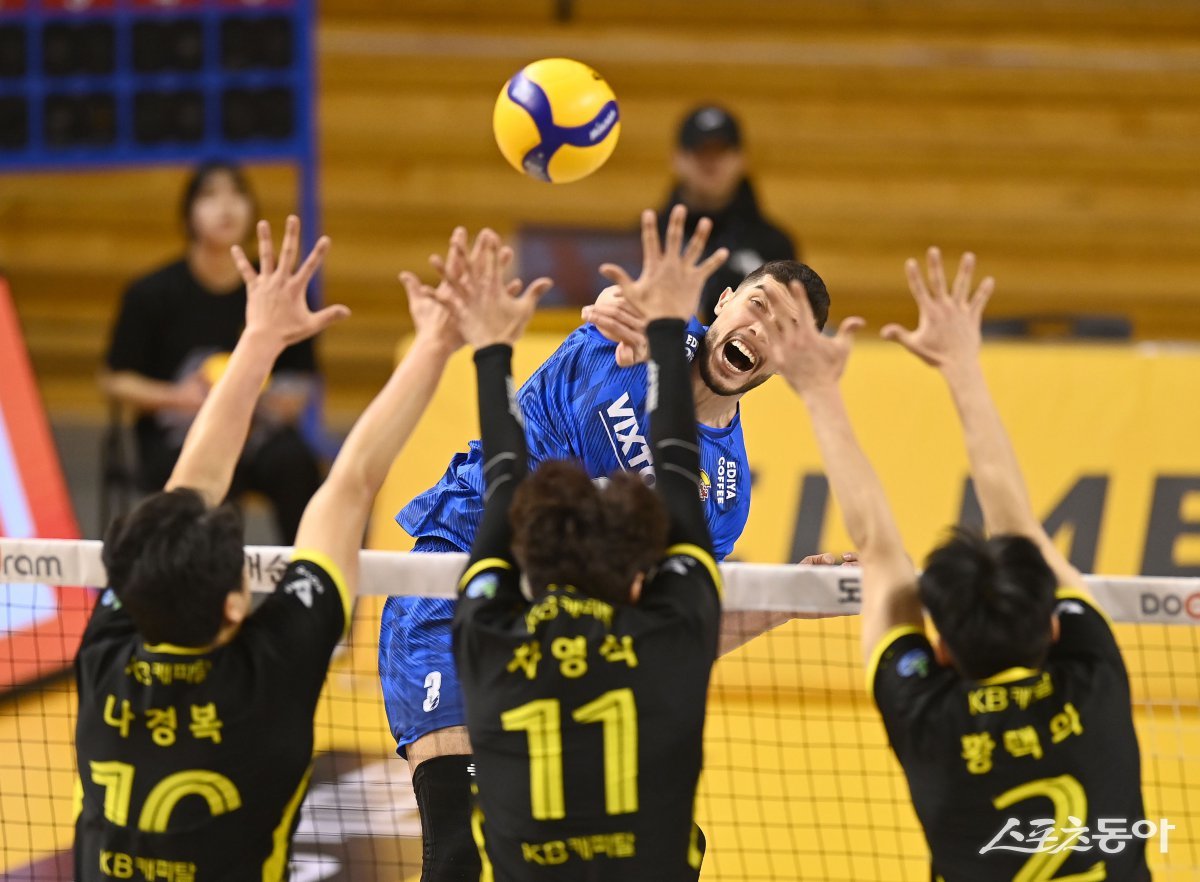 22일 의정부 경민대 체육관에서 열린 ‘도드람 2024~2025 V-리그’ 남자부 KB손해보험과 한국전력 경기에서 한국전력 마테우스가 KB손해보험 블로킹 사이로 스파이크를 날리고 있다. 의정부 | 김종원 기자 won@donga.com