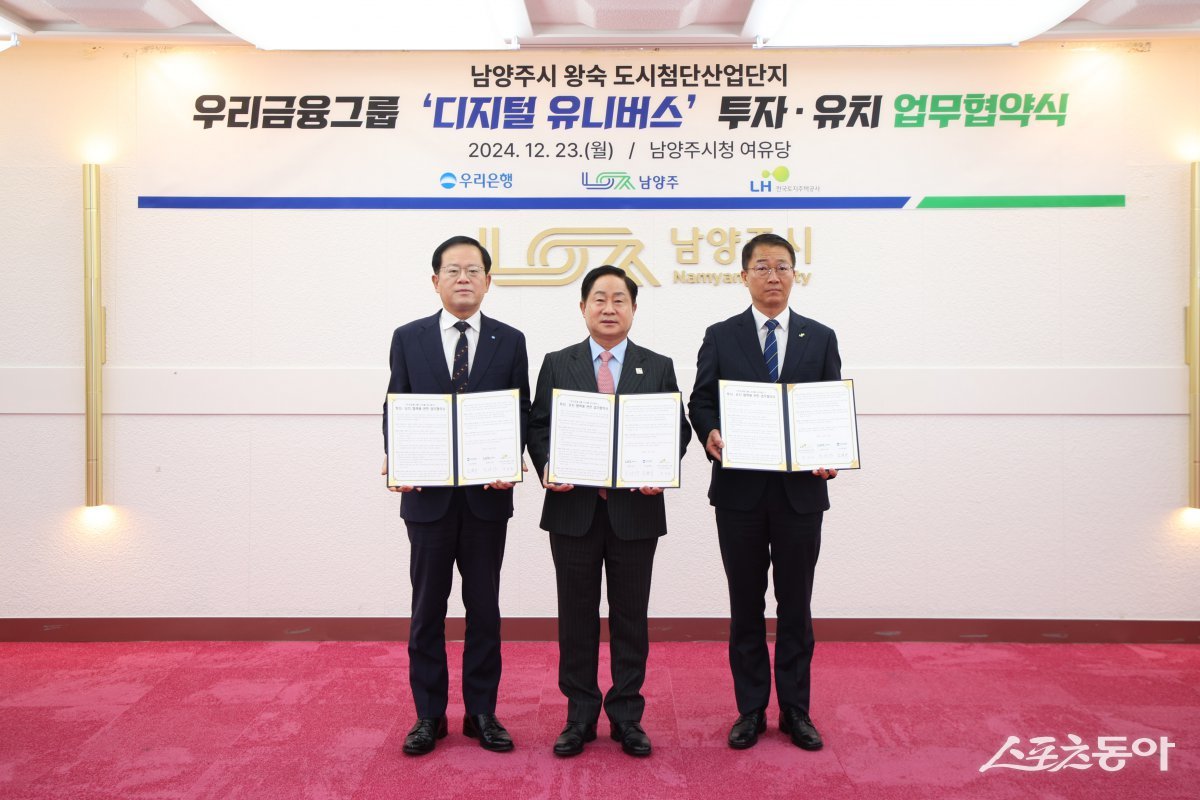남양주시(시장 주광덕)는 23일 시청에서 ㈜우리은행 및 한국토지주택공사(LH)와 함께 우리금융그룹 미래형 통합 IT센터 ‘디지털 유니버스’ 건립을 위한 업무협약(MOU)을 체결했다.
