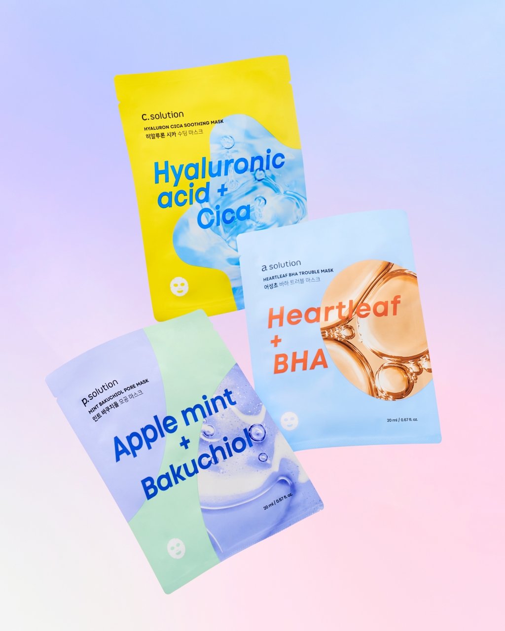 ‘비건 생분해 젤리 시트’를 사용해 젤리처럼 뛰어난 밀착력이 특징이다. 트러블 흔적 솔루션을 위한 ‘에이솔루션 어성초 바하 트러블 마스크’, 수분 진정 솔루션을 위한 ‘씨솔루션 히알루론 시카 수딩 마스크’, 모공 탄력 솔루션을 위한 ‘피솔루션 민트 바쿠치올 모공 마스크’ 등 3종으로 구성했다.