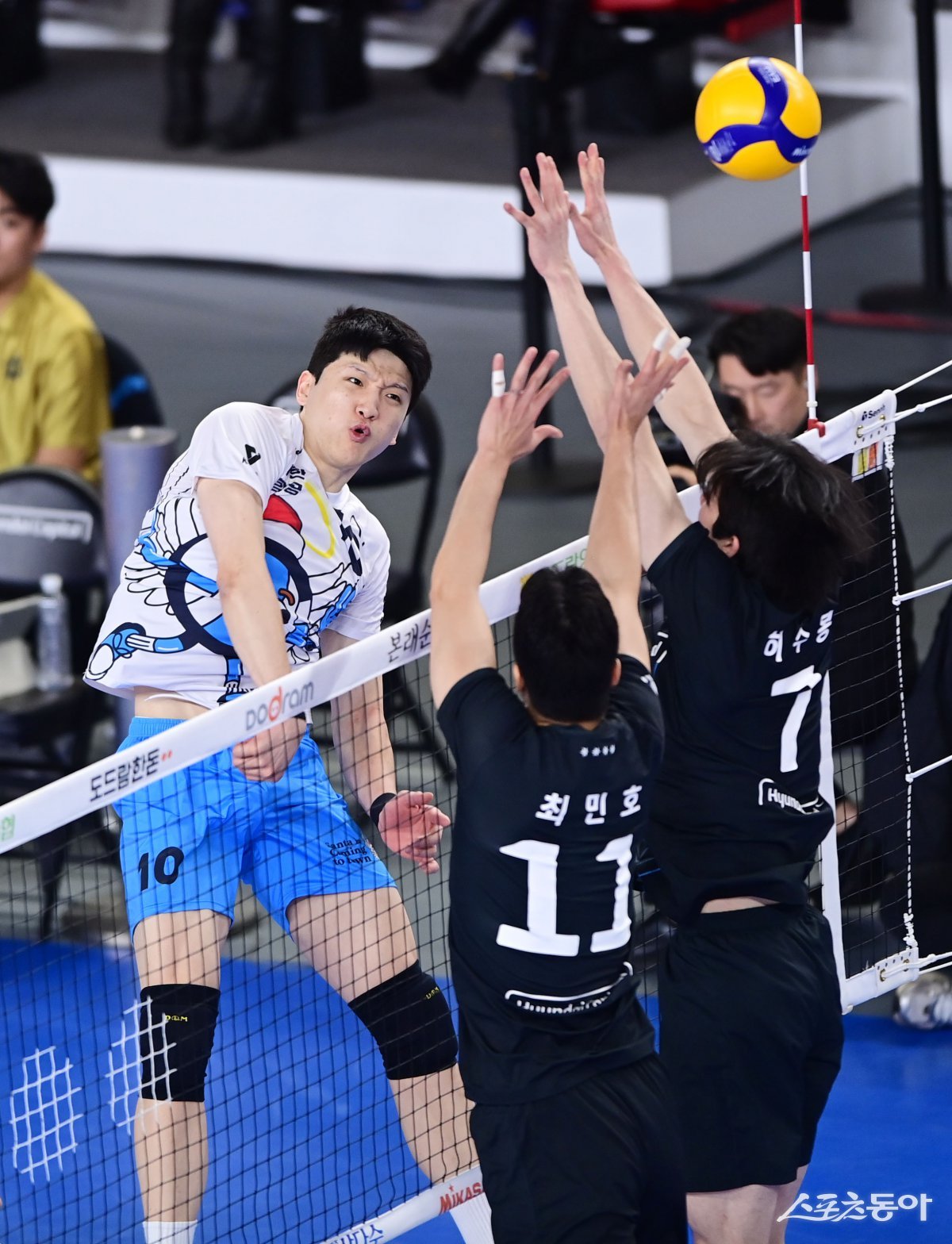 25일 천안종합운동장 유관순체육관에서 열린 ‘도드람 2024-2025 V리그’ 남자부 천안 현대캐피탈과 인천 대한항공의 경기에서 대한항공 정지석이 현대캐피탈 블로커 앞에서 스파이크를 하고 있다. 천안 | 주현희 기자 teth1147@donga.com