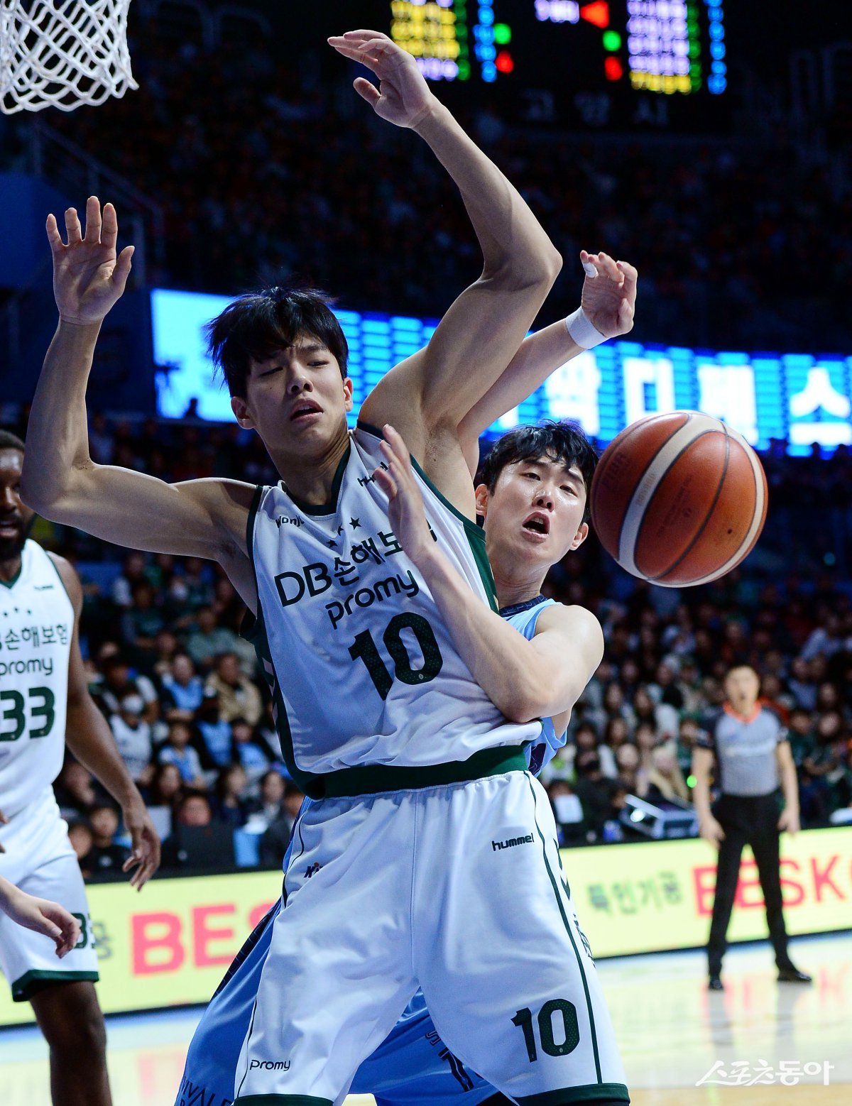 25일 경기도 고양체육관에서 열린 ‘2024-2025 KCC 프로농구’ 고양 소노와 원주 DB의 경기에서 DB 김보배와 소노 임동섭이 리바운드를 다투고 있다. 고양 | 김민성 기자 marineboy@donga.com