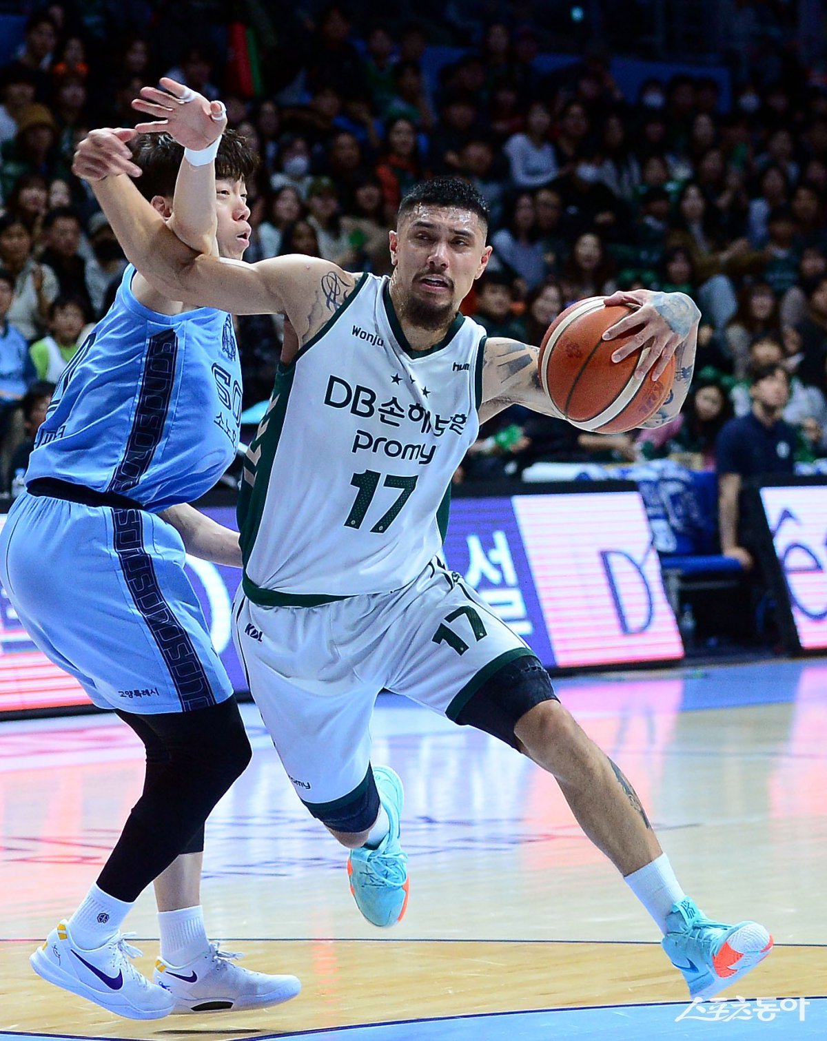 25일 경기도 고양체육관에서 열린 ‘2024-2025 KCC 프로농구’ 고양 소노와 원주 DB의 경기에서 DB 알바노가 소노 수비를 제치며 돌파하고 있다. 고양 | 김민성 기자 marineboy@donga.com