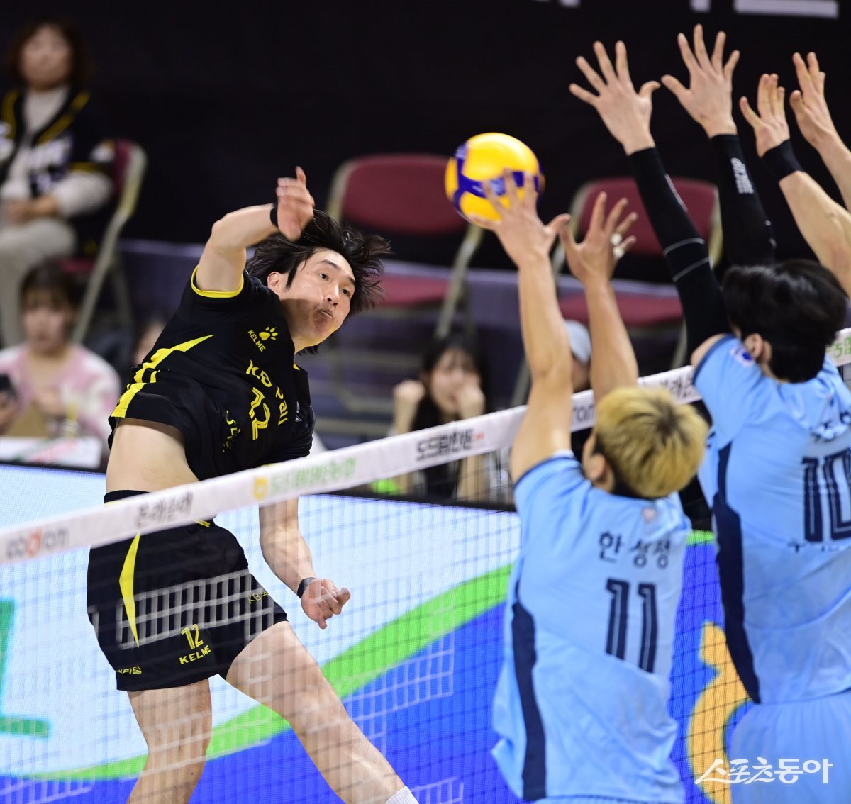26일 경기 의정부 경민대학교 체육관에서 열린 ‘도드람 2024-2025 V리그’ 남자부 의정부 KB손해보험과 서울 우리카드의 경기에서 KB손해보험 황경민이 우리카드 블로커 앞에서 스파이크를 하고 있다. 의정부 | 주현희 기자 teth1147@donga.com