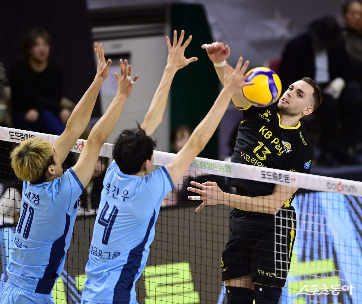 26일 경기 의정부 경민대학교 체육관에서 열린 ‘도드람 2024-2025 V리그’ 남자부 의정부 KB손해보험과 서울 우리카드의 경기에서 KB손해보험 비예나가 우리카드 블로커 앞에서 스파이크를 하고 있다. 의정부 | 주현희 기자 teth1147@donga.com
