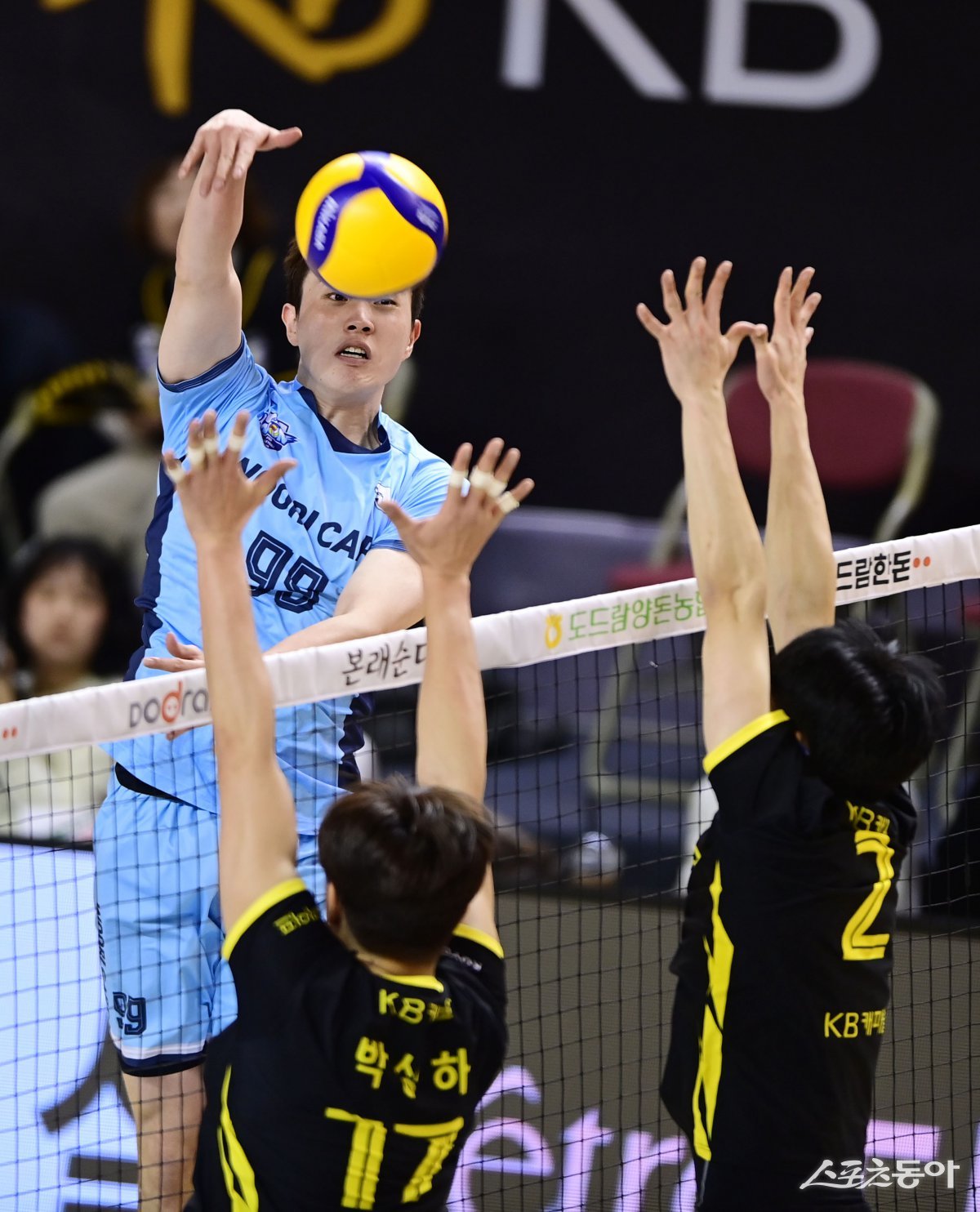 26일 경기 의정부 경민대학교 체육관에서 열린 ‘도드람 2024-2025 V리그’ 남자부 의정부 KB손해보험과 서울 우리카드의 경기에서 우리카드 김지한이 KB손해보험 블로커 앞에서 스파이크를 하고 있다. 의정부 | 주현희 기자 teth1147@donga.com
