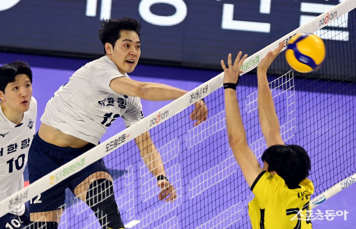 29일 인천 계양체육관에서 ‘도드람 2024-2025 V리그’ 인천 대한항공과 의정부 KB손해보험의 남자부 경기가 열렸다. 대한항공 조재영이 KB손해보험 블로커를 피해 공격을 펼치고 있다. 인천 | 김민성 기자 marineboy@donga.com