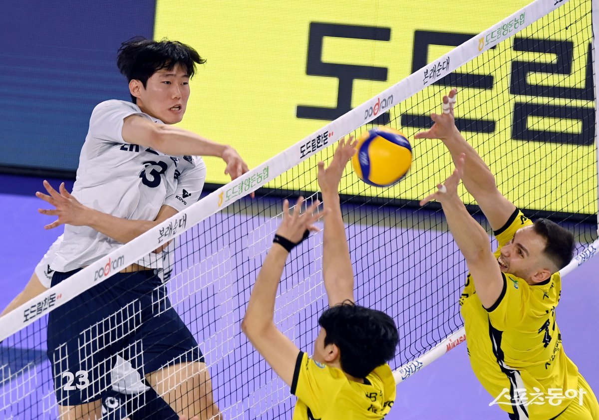 29일 인천 계양체육관에서 ‘도드람 2024-2025 V리그’ 인천 대한항공과 의정부 KB손해보험의 남자부 경기가 열렸다. 대한항공 김민재가 KB손해보험 블로커를 피해 공격을 펼치고 있다. 인천 | 김민성 기자 marineboy@donga.com