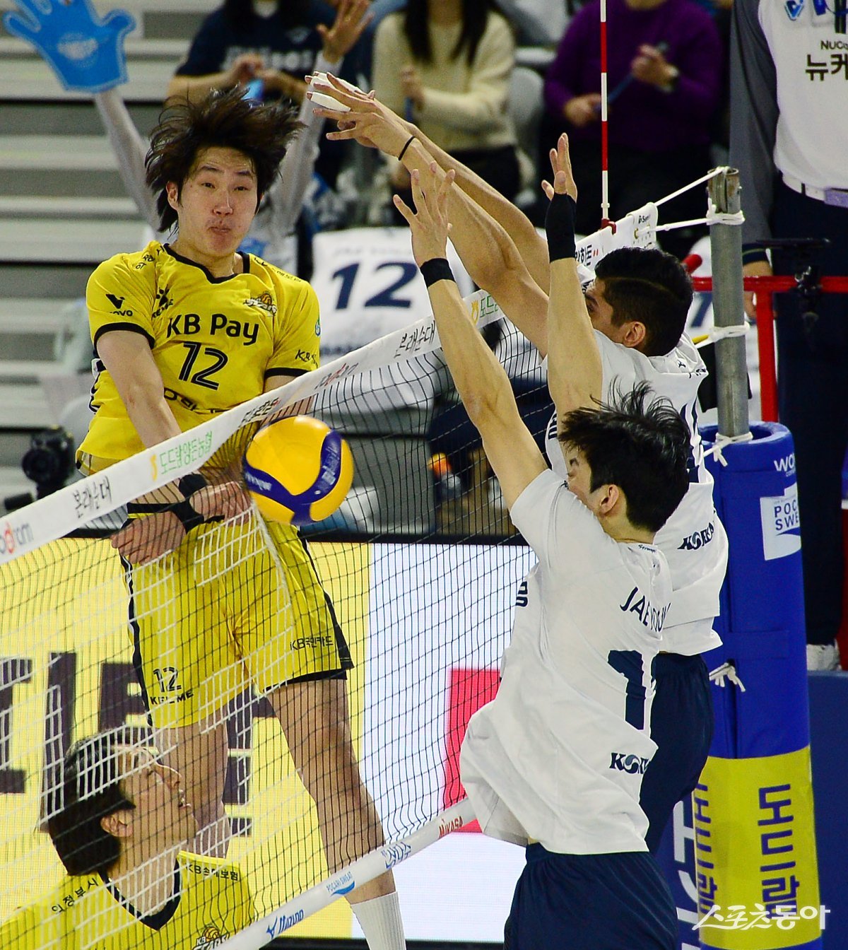 29일 인천 계양체육관에서 ‘도드람 2024-2025 V리그’ 인천 대한항공과 의정부 KB손해보험의 남자부 경기가 열렸다. KB손해보험 황경민이 대한항공 블로커를 피해 스파이크를 날리고 있다. 인천 | 김민성 기자 marineboy@donga.com