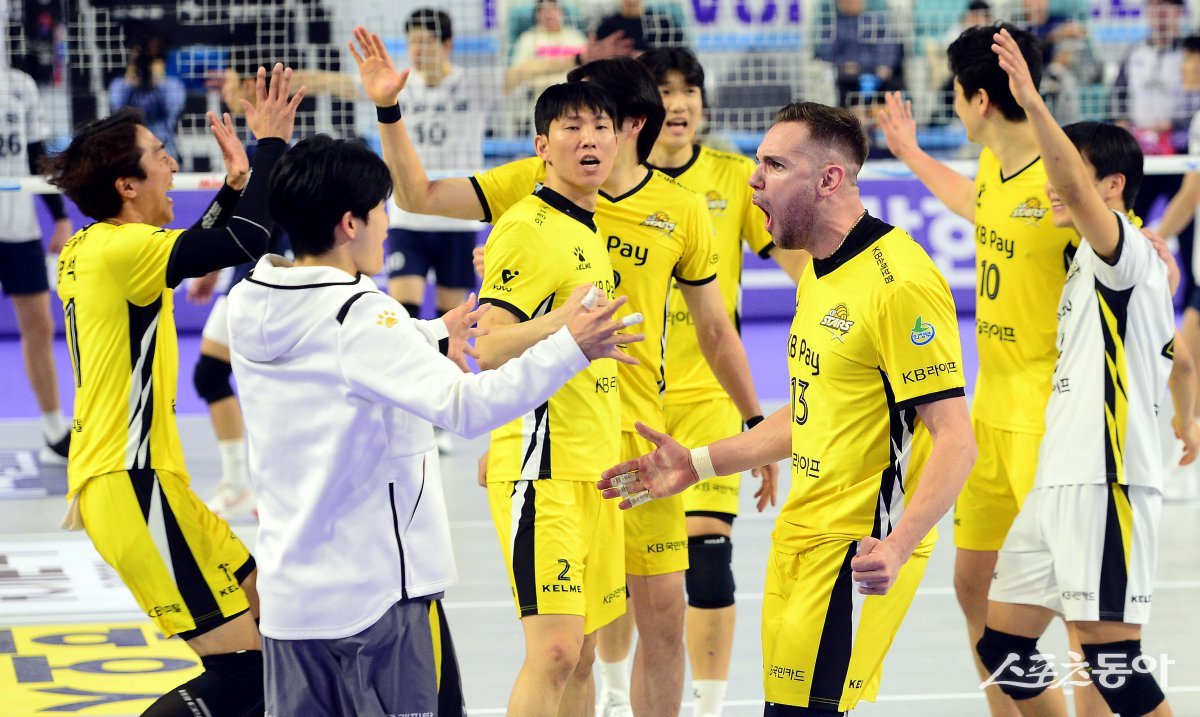 29일 인천 계양체육관에서 ‘도드람 2024-2025 V리그’ 인천 대한항공과 의정부 KB손해보험의 남자부 경기가 열렸다. KB손해보험이 대한항공을 상대로 세트스코어 3-2 승리 후 선수들이 기쁨을 나누고 있다. 인천 | 김민성 기자 marineboy@donga.com