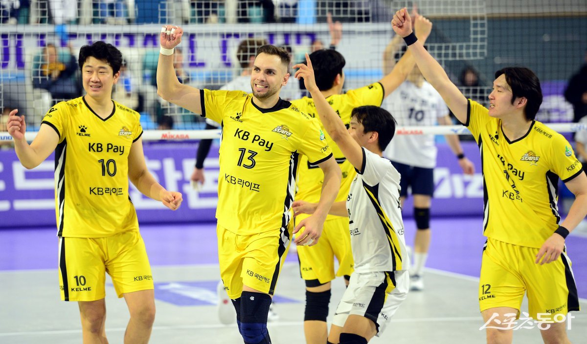29일 인천 계양체육관에서 ‘도드람 2024-2025 V리그’ 인천 대한항공과 의정부 KB손해보험의 남자부 경기가 열렸다. KB손해보험 비예나가 득점 후 기뻐하고 있다. 인천 | 김민성 기자 marineboy@donga.com