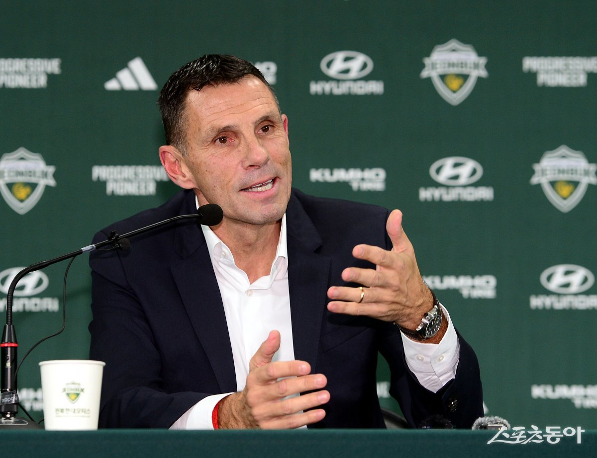 전북 현대 거스 포옛 신임 감독이 30일 전북월드컵경기장에서 열린 취임 기자회견에 참석해 포부를 밝히고 있다. 전주 | 김민성 기자 marineboy@donga.com