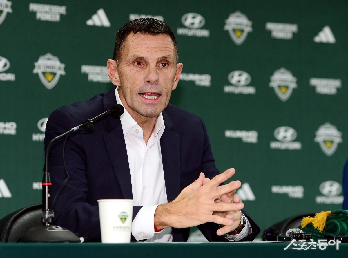 전북 현대 거스 포옛 신임 감독이 30일 전북월드컵경기장에서 열린 취임 기자회견에 참석해 포부를 밝히고 있다. 전주 | 김민성 기자 marineboy@donga.com