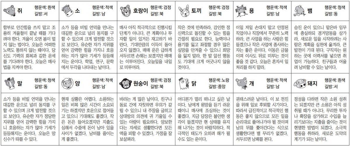 쥐띠 : 함부로 안간힘을 쓰지 말고 조용히 겨울철이 끝날 때를 기다려야 한다. 겨울이 오면 봄이 멀지 않는 법이다. 오늘은 어떠한노력도 통하지 않는 때이다. 당신도 기력의 회복과 길한 운세를 기다려야 한다. 오늘은 매사법을 지켜야 한다.