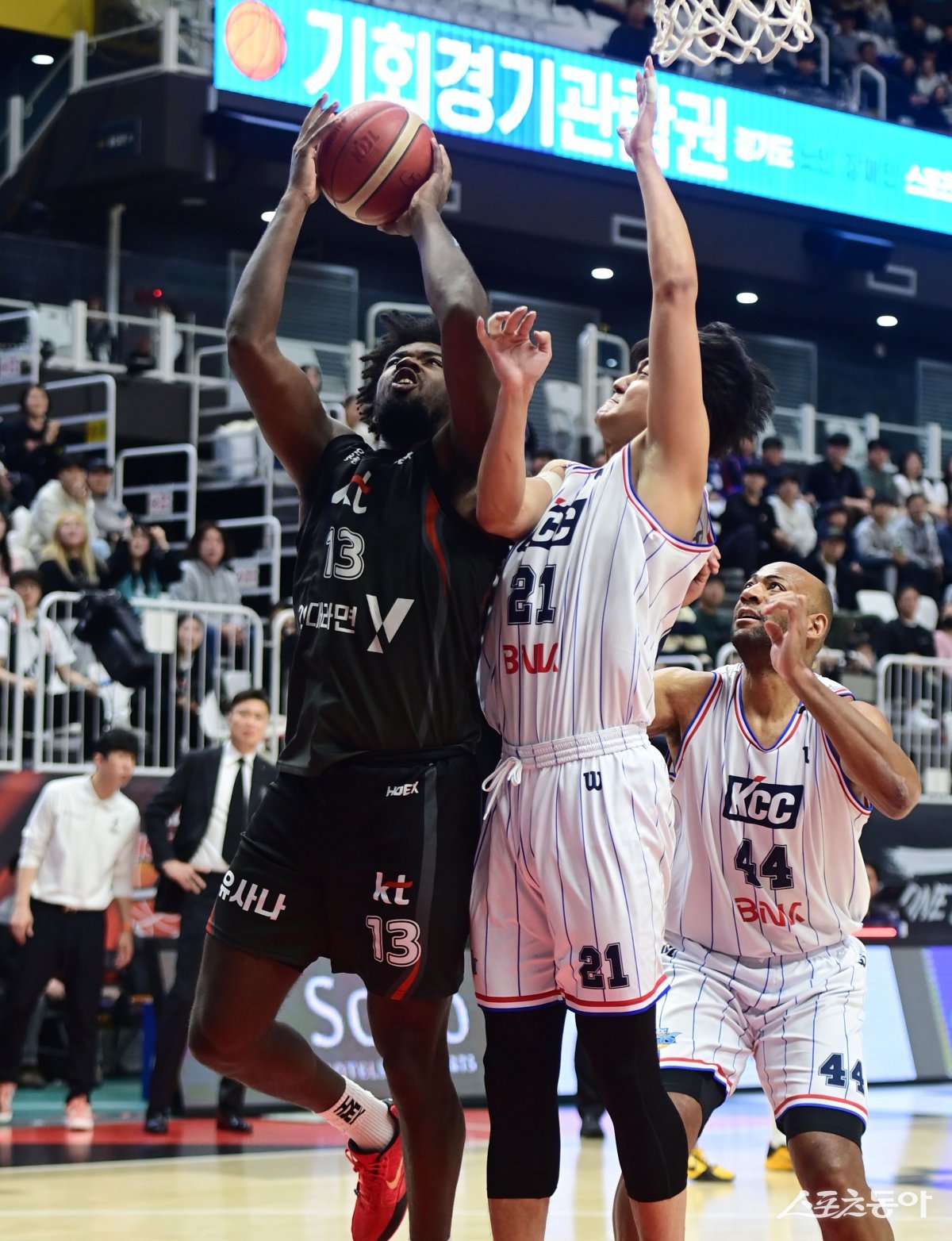 1일 수원KT소닉붐아레나에서 열린 ‘2024-2025 KCC 프로농구’ 수원 KT와 부산 KCC의 경기에서 KT 해먼즈가 KCC 수비 앞에서 슛을 하고 있다. 수원 | 주현희 기자 teth1147@donga.com