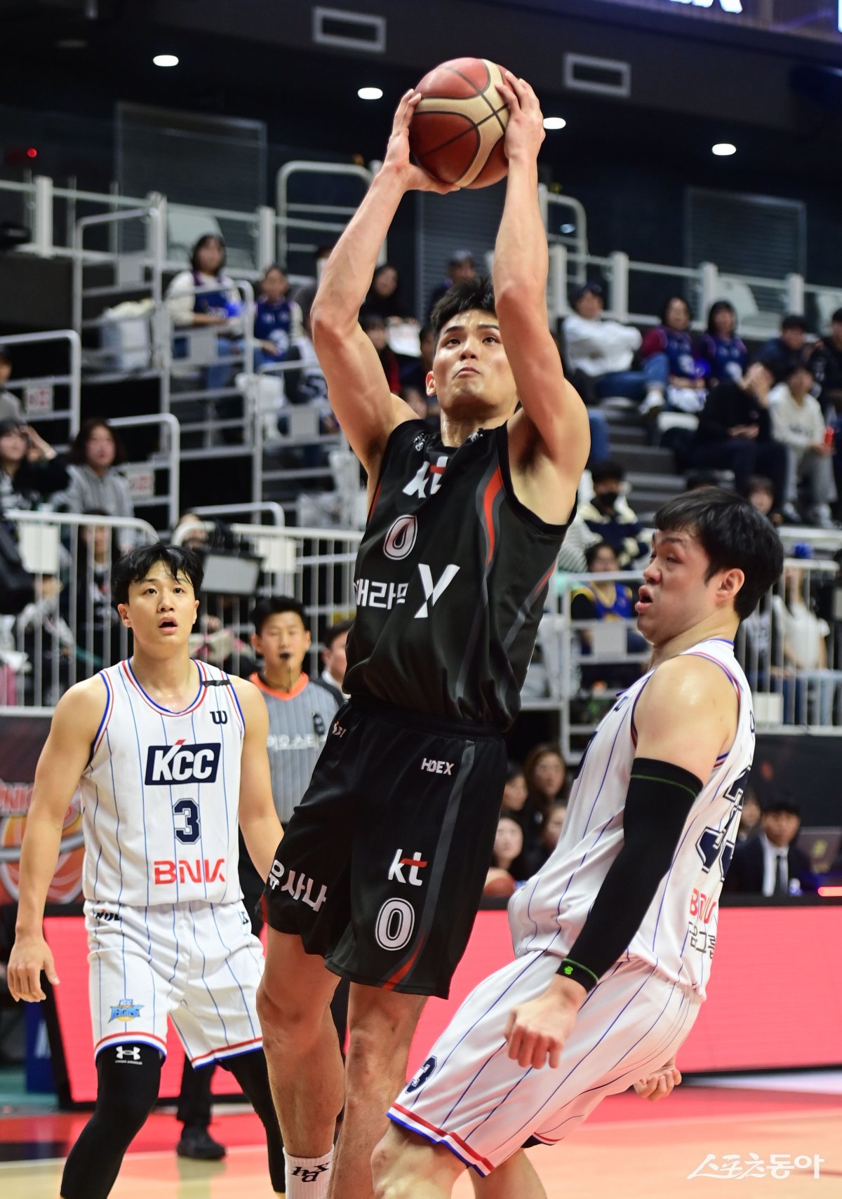 1일 수원KT소닉붐아레나에서 열린 ‘2024-2025 KCC 프로농구’ 수원 KT와 부산 KCC의 경기에서 KT 하윤기가 KCC 이승현의 수비를 뚫고 슛을 하고 있다. 수원 | 주현희 기자 teth1147@donga.com