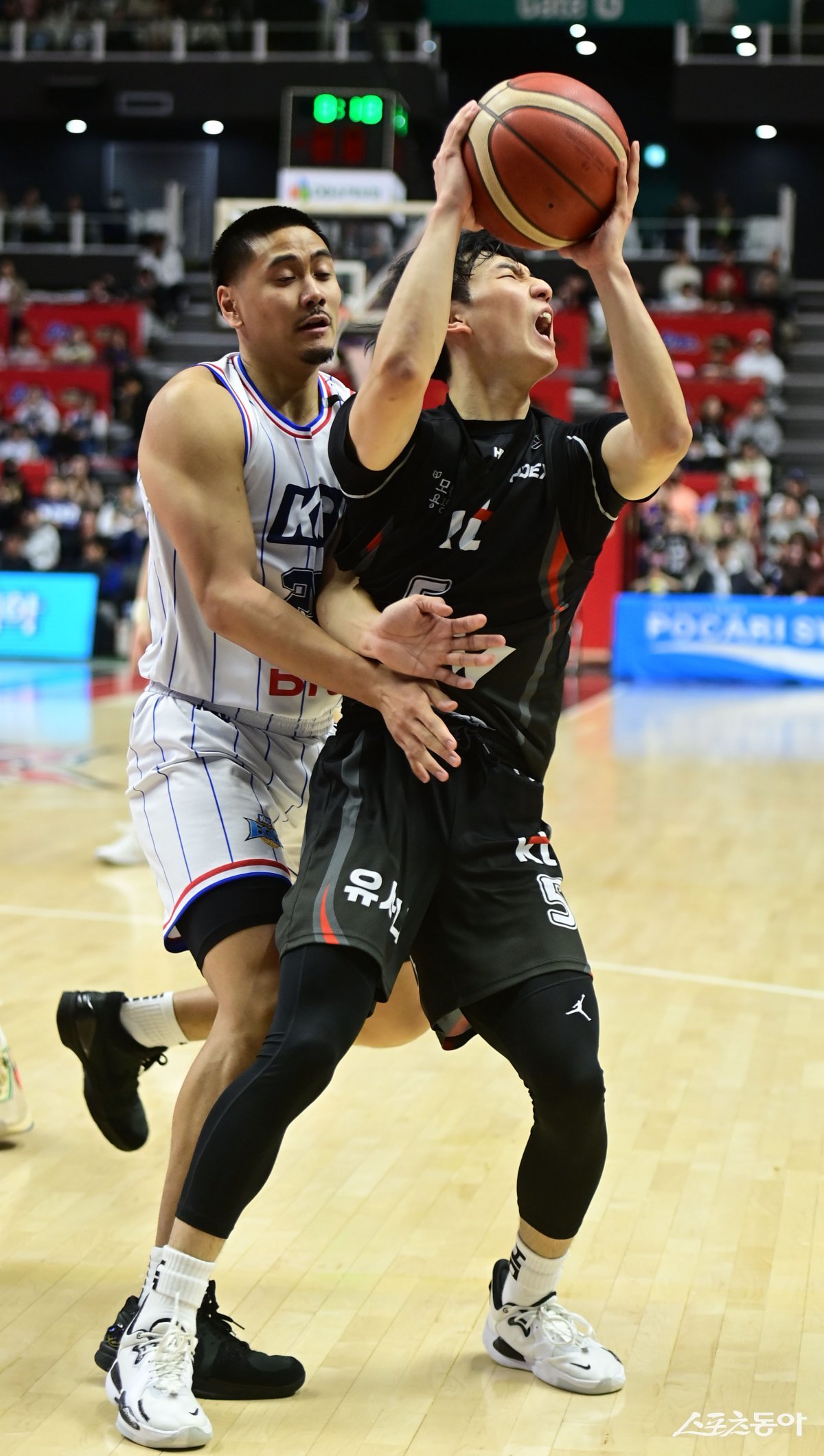 1일 수원KT소닉붐아레나에서 열린 ‘2024-2025 KCC 프로농구’ 수원 KT와 부산 KCC의 경기에서 KT 최진광이 KCC 에피스톨라로부터 반칙을 당하고 있다. 수원 | 주현희 기자 teth1147@donga.com