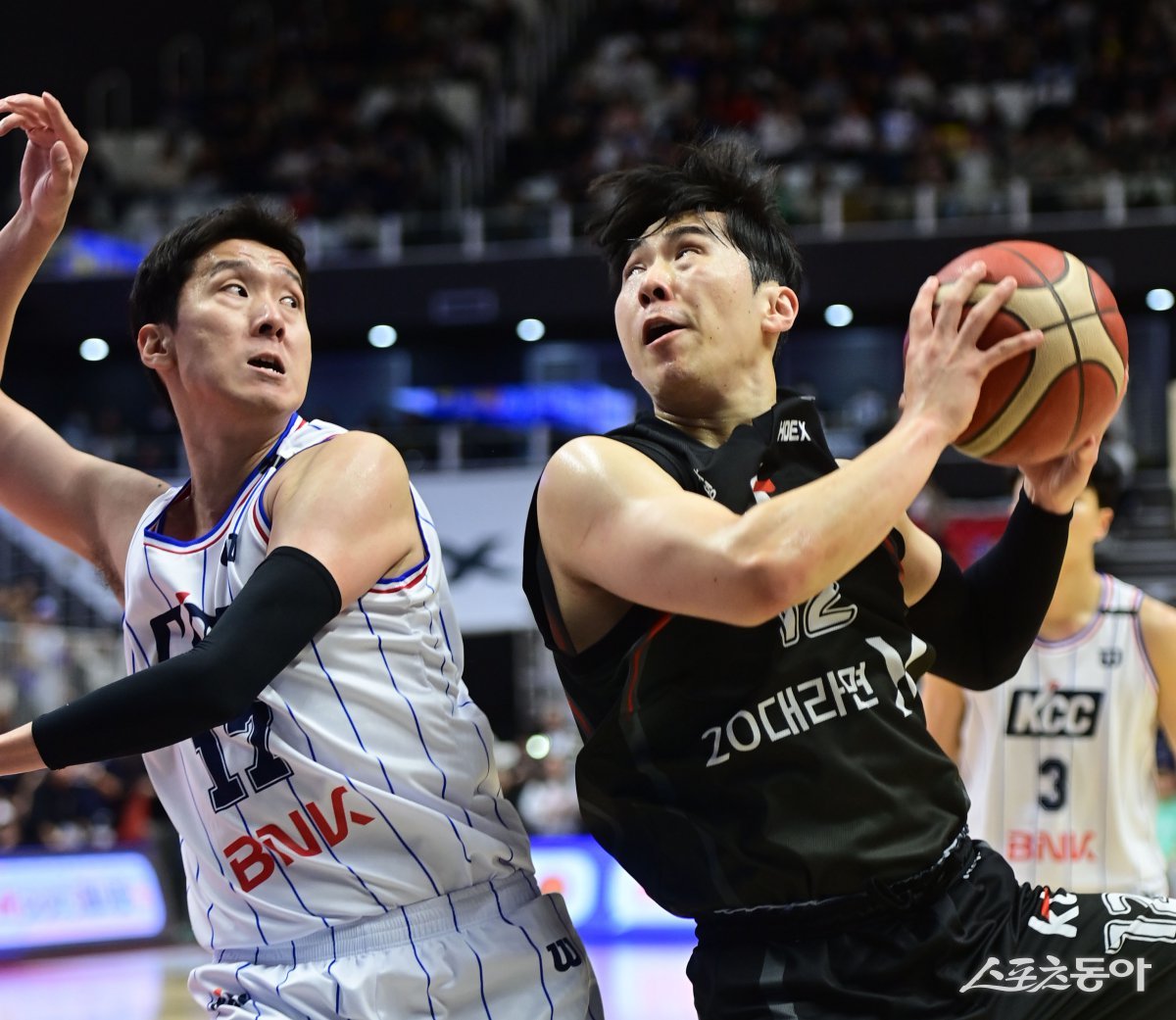 1일 수원KT소닉붐아레나에서 열린 ‘2024-2025 KCC 프로농구’ 수원 KT와 부산 KCC의 경기에서 KT 문정현이 KCC 전준범의 앞에서 리바운드된 볼을 잡고 있다. 수원 | 주현희 기자 teth1147@donga.com