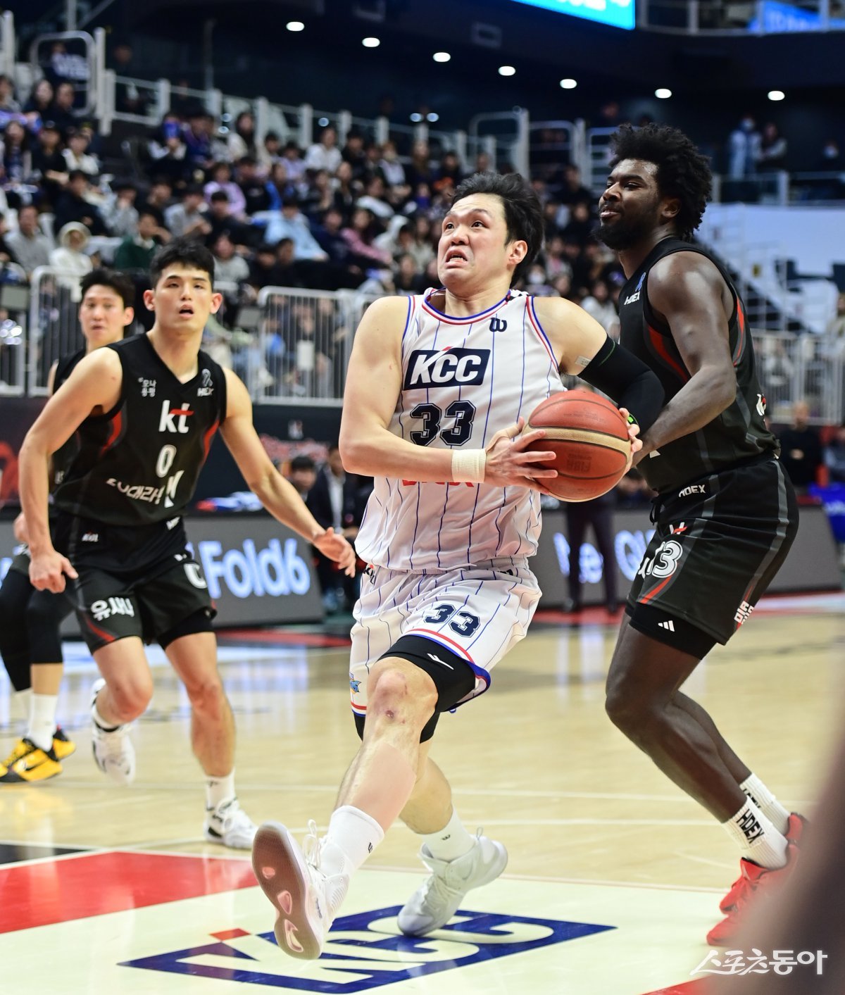 1일 수원KT소닉붐아레나에서 열린 ‘2024-2025 KCC 프로농구’ 수원 KT와 부산 KCC의 경기에서 KCC 이승현이 KT 수비를 뚫고 골밑 돌파를 하고 있다. 수원 | 주현희 기자 teth1147@donga.com