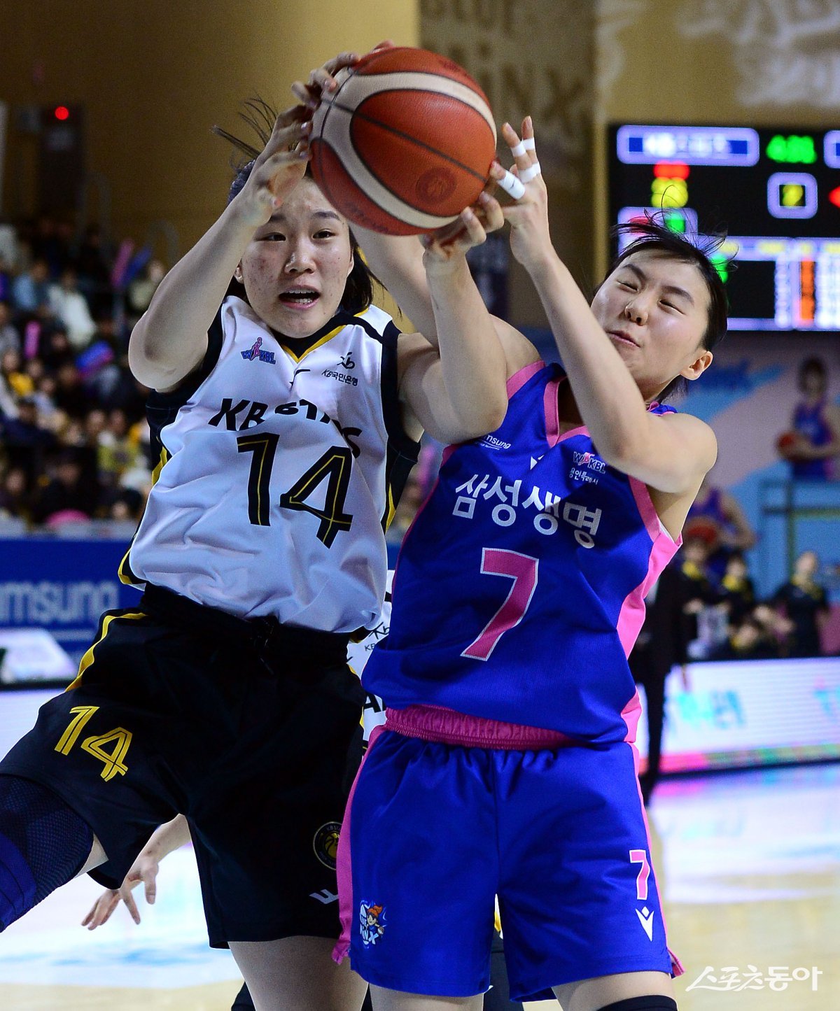1일 경기도 용인실내체육관에서 열린 ‘하나은행 2024-2025 여자프로농구’ 용인 삼성생명과 청주 KB의 경기에서 삼성생명 강유림과 KB 송윤하가 리바운드를 다투고 있다. 용인 | 김민성 기자 marineboy@donga.com