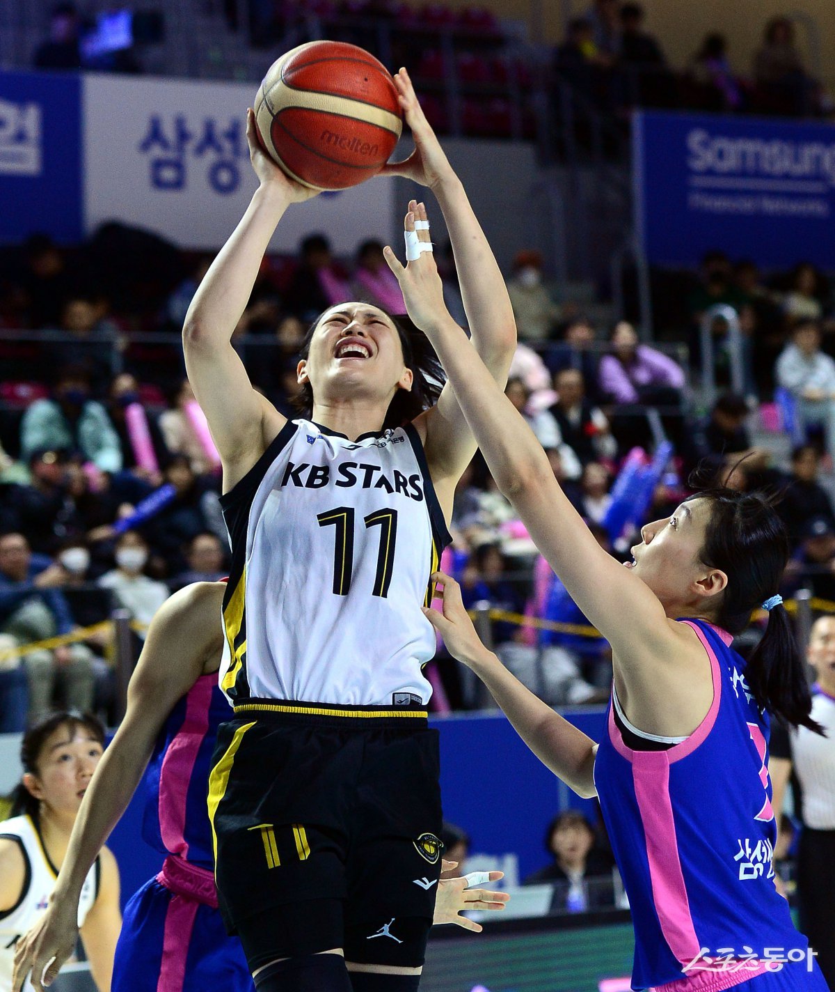 1일 경기도 용인실내체육관에서 열린 ‘하나은행 2024-2025 여자프로농구’ 용인 삼성생명과 청주 KB의 경기에서 KB 강이슬이 삼성생명 강유림의 수비를 피해 슛을 쏘고 있다. 용인 | 김민성 기자 marineboy@donga.com