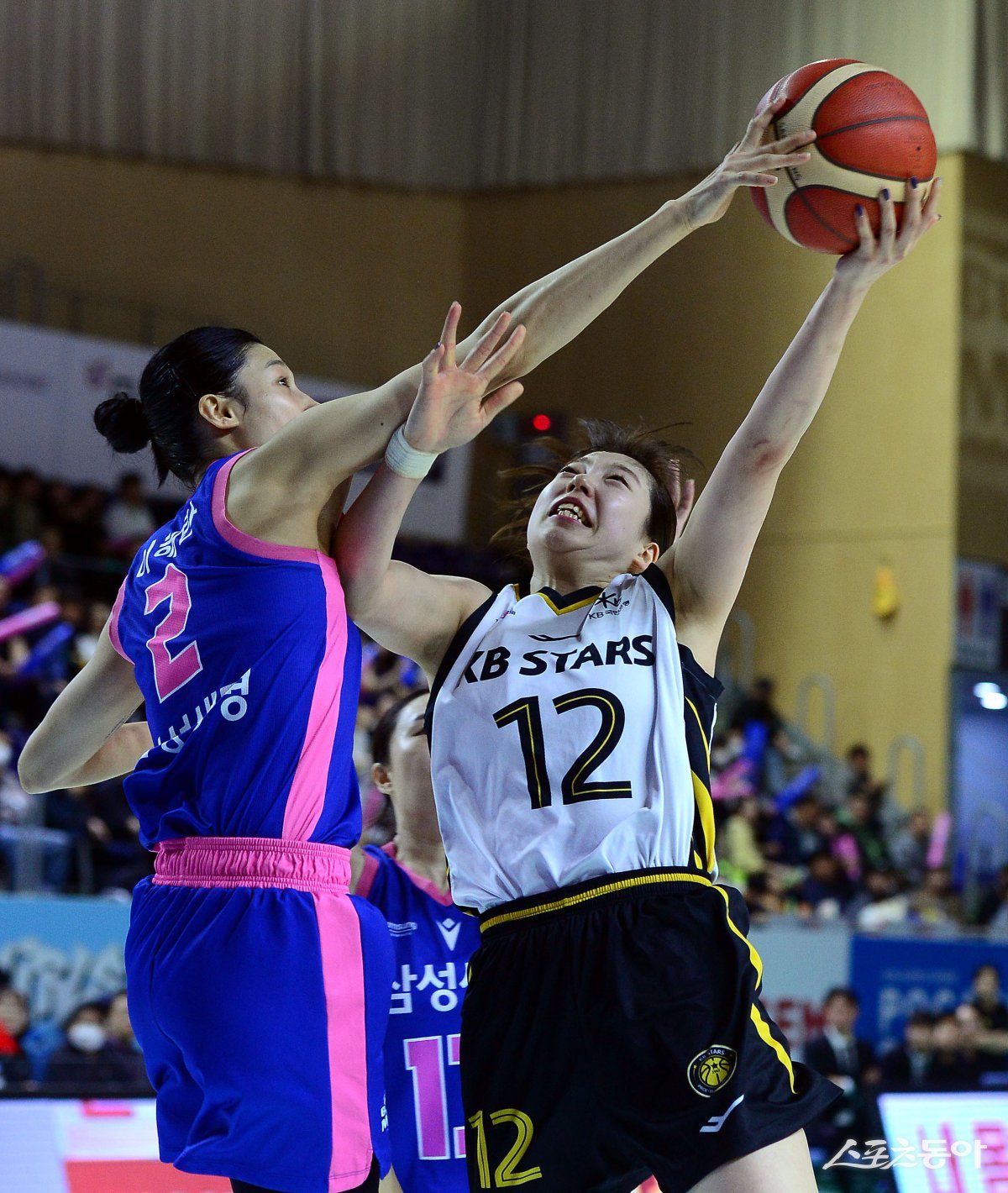 1일 경기도 용인실내체육관에서 열린 ‘하나은행 2024-2025 여자프로농구’ 용인 삼성생명과 청주 KB의 경기에서 KB 나가타 모에의 슛을 삼성생명 이해란이 블록슛으로 막아내고 있다. 용인 | 김민성 기자 marineboy@donga.com
