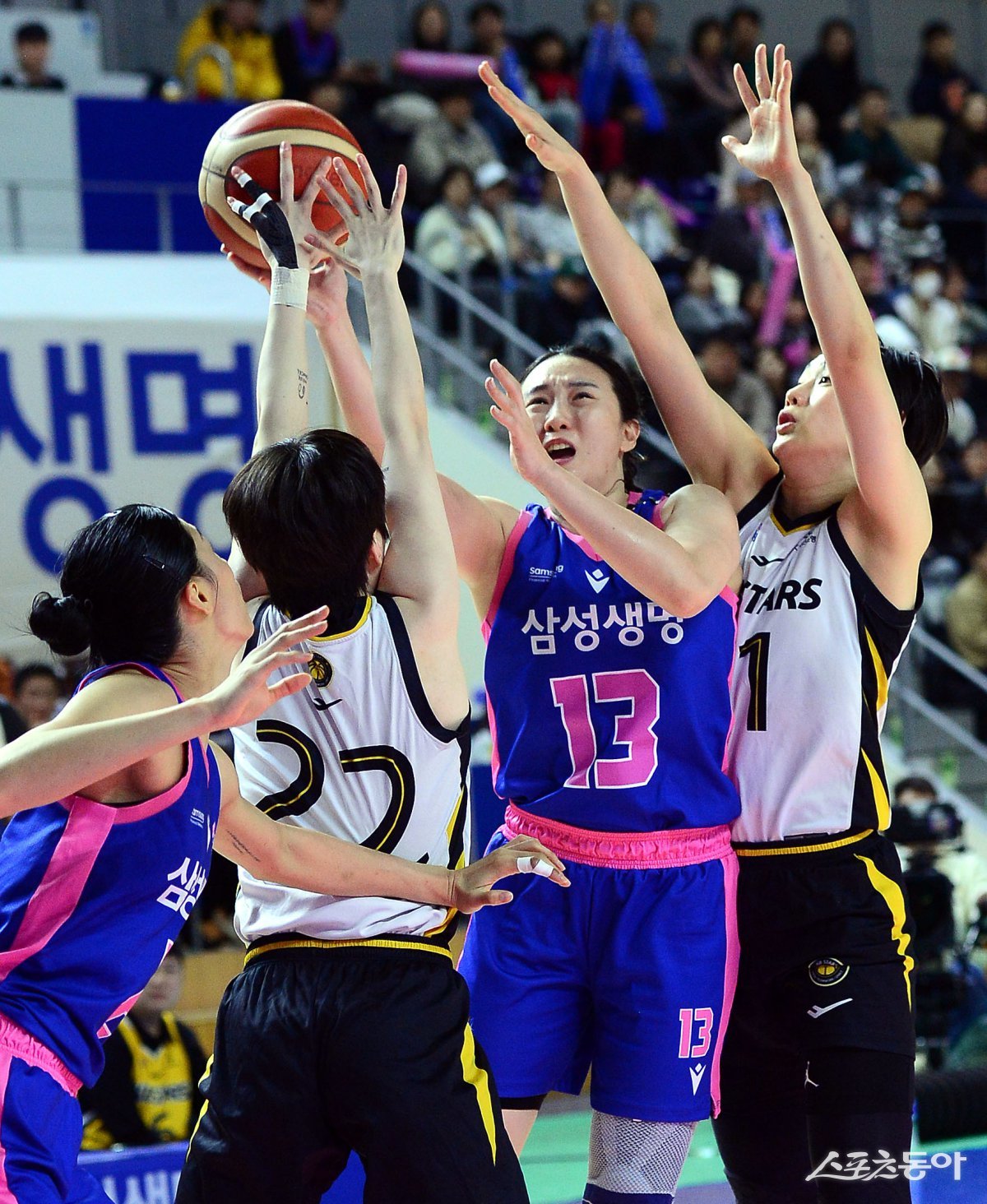 1일 경기도 용인실내체육관에서 열린 ‘하나은행 2024-2025 여자프로농구’ 용인 삼성생명과 청주 KB의 경기에서 삼성생명 김단비가 KB 수비를 피해 슛을 쏘고 있다. 용인 | 김민성 기자 marineboy@donga.com