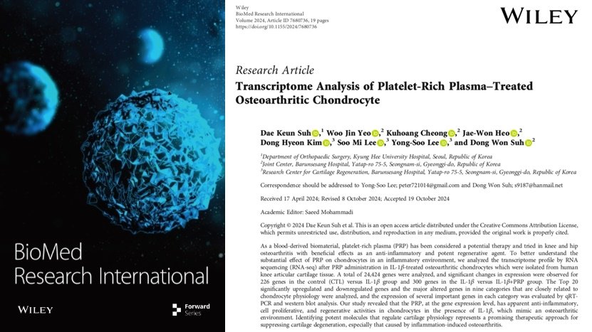 ‘골관절염 연골세포에 혈소판 풍부 혈장 처리 후 유전자 전사체 분석’이란 제목의 이번 논문은 무릎이나 고관절, 골관절염 등 다양한 근골격계 손상이나 질환에 대한 재생치료에 많이 쓰이는 혈소판 풍부 형장에 대한 연구이다.