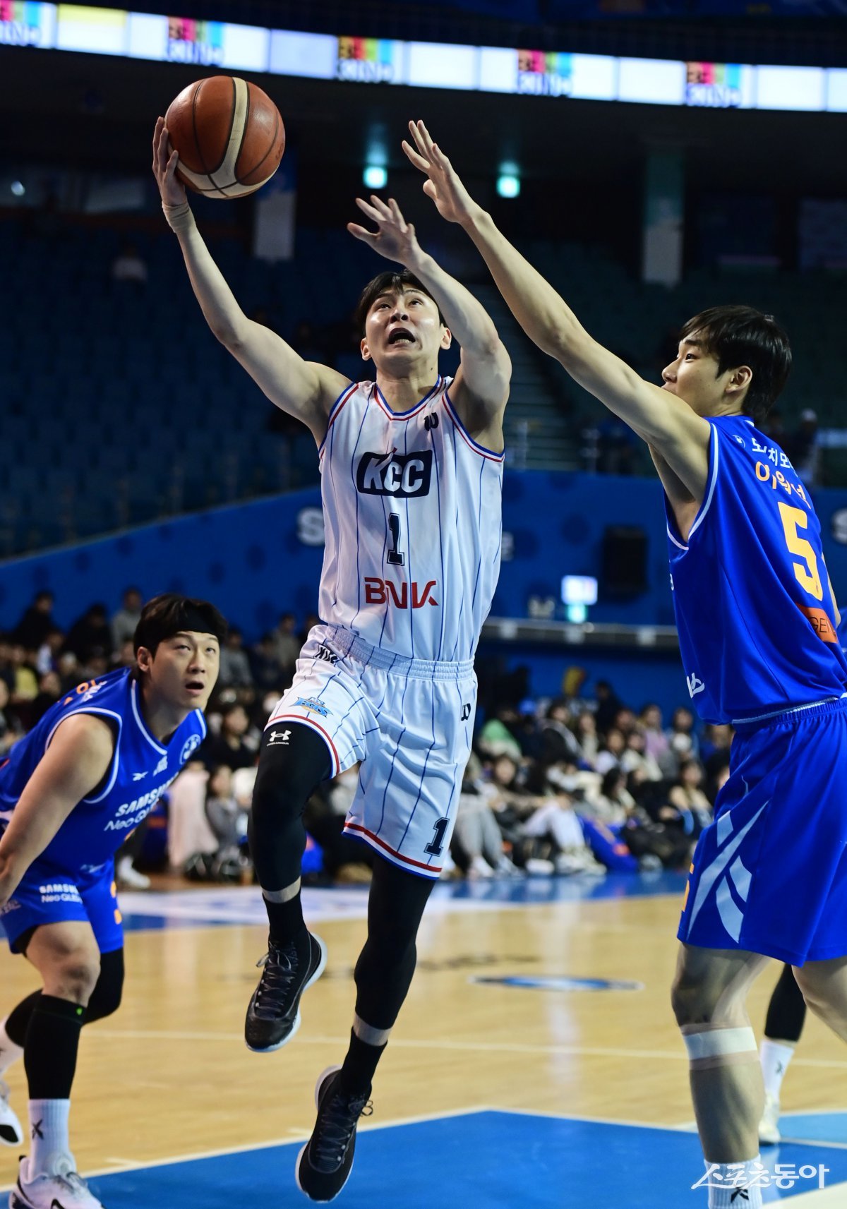 6일 서울 잠실체육관에서 열린 ‘2024-2025 KCC 프로농구’ 서울 삼성과 부산 KCC의 경기에서 KCC 이호현이 삼성 이원석의 수비를 뚫고 슛을 하고 있다. 잠실 | 주현희 기자 teth1147@donga.com