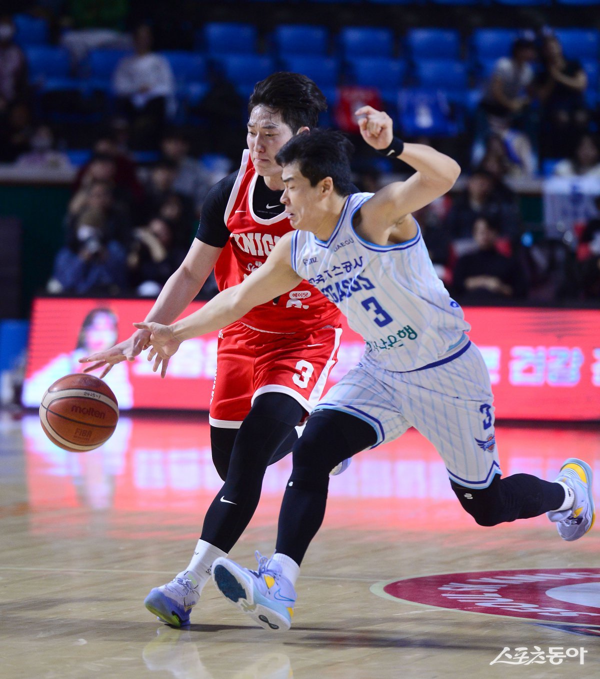 7일 서울 잠실학생체육관에서 열린 ‘2024-2025 프로농구’ SK와 한국가스공사 경기에서 한국가스공사 정성우가 SK 최원혁의 볼을 가로채기하고 있다. 잠실|김종원 기자 won@donga.com