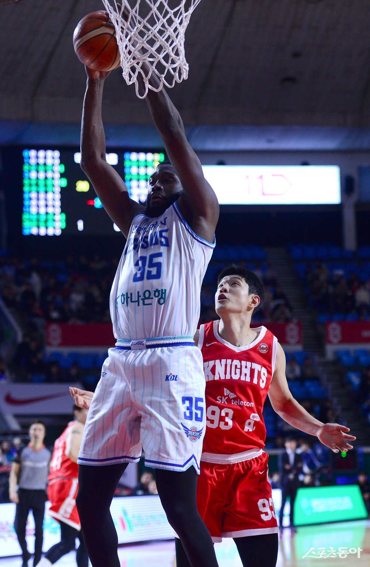 7일 서울 잠실학생체육관에서 열린 ‘2024-2025 프로농구’ SK와 한국가스공사 경기에서 한국가스공사 유슈 은도예가 리바운드 볼을 잡고 있다. 잠실|김종원 기자 won@donga.com