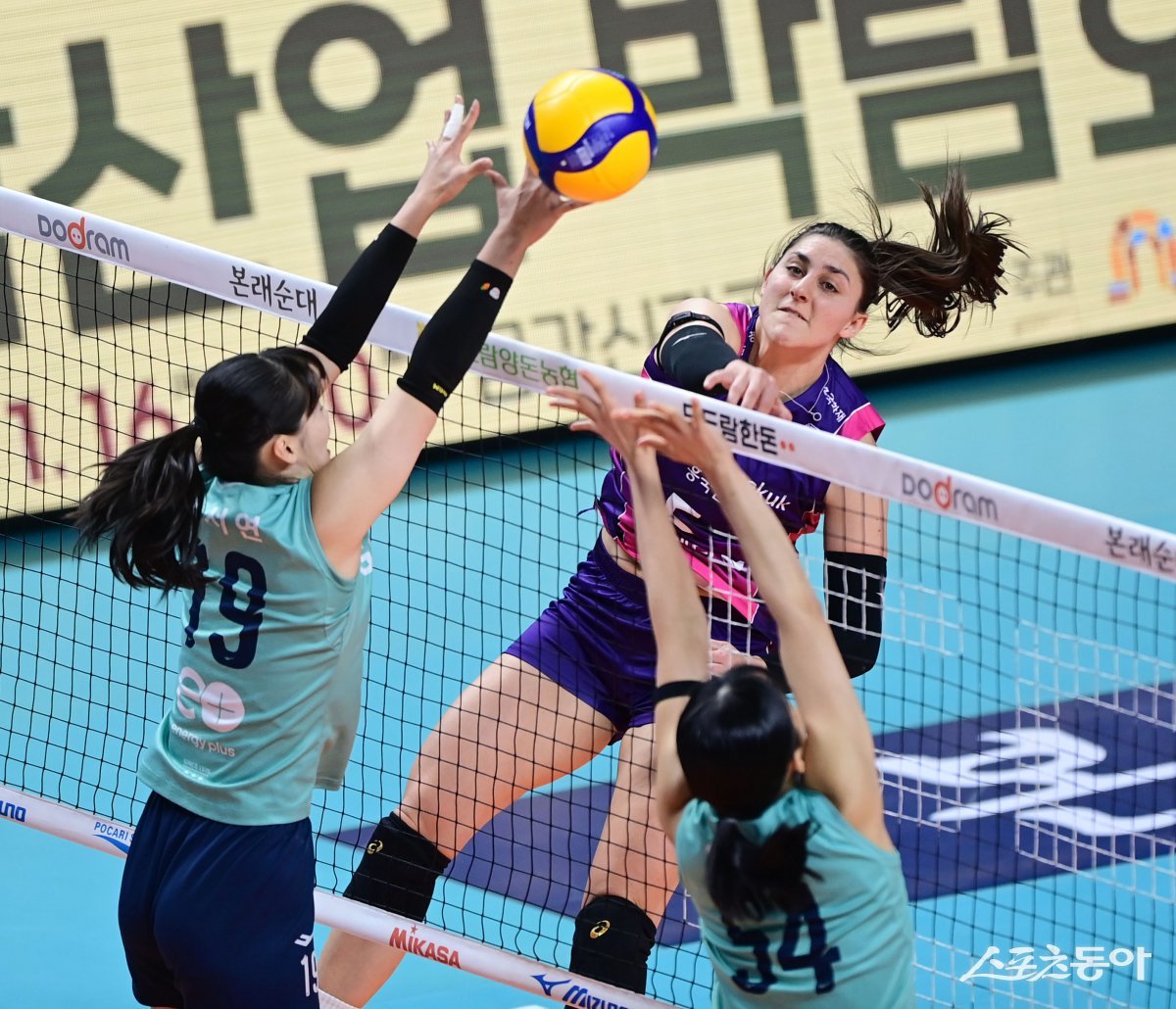 7일 서울 장충체육관에서 열린 ‘도드람 2024-2025 V리그’ 여자부 서울 GS칼텍스와 인천 흥국생명의 경기에서 흥국생명 피치가 GS칼텍스 블로커 앞에서 스파이크를 하고 있다. 장충 | 주현희 기자 teth1147@donga.com