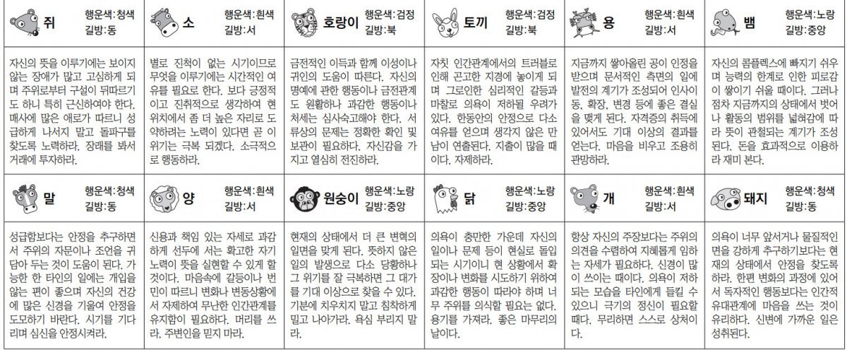 호랑이띠 : 금전적인 이득과 함께 이성이나귀인의 도움이 따른다. 자신의명예에 관한 행동이나 금전관계도 원활하나 과감한 행동이나처세는 심사숙고해야 한다. 서류상의 문제는 정확한 확인 및보관이 필요하다. 자신감을 가지고 열심히 전진하라.