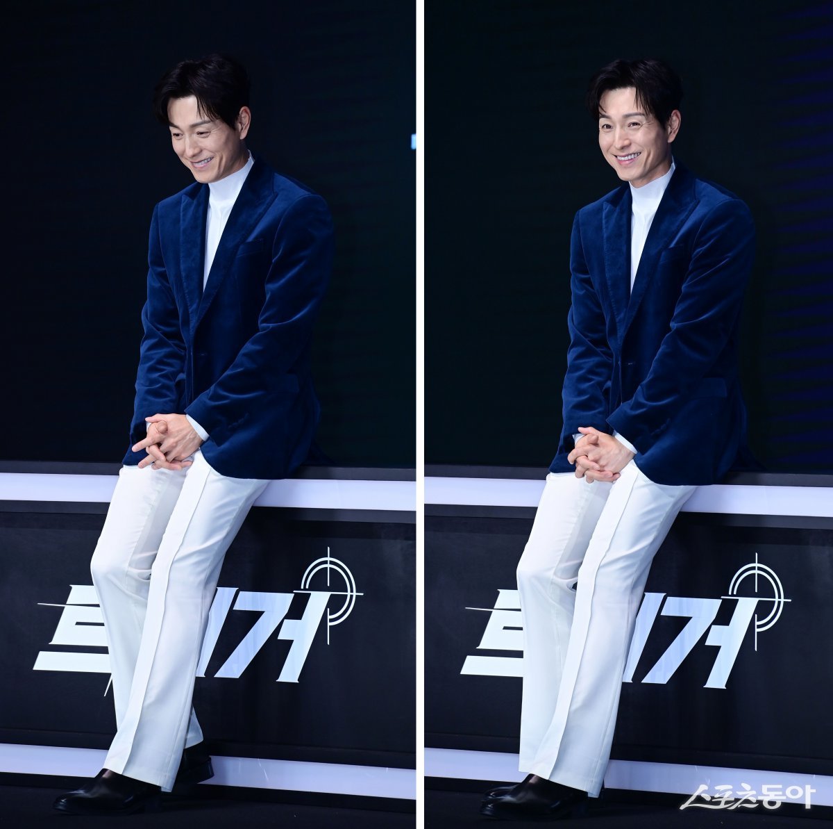 배우 정성일이 8일 서울 영등포구 여의도동 콘래드서울에서 열린 디즈니플러스 ‘트리거’ 제작발표회에서 포즈를 취하고 있다. 주현희 기자 teth1147@donga.com