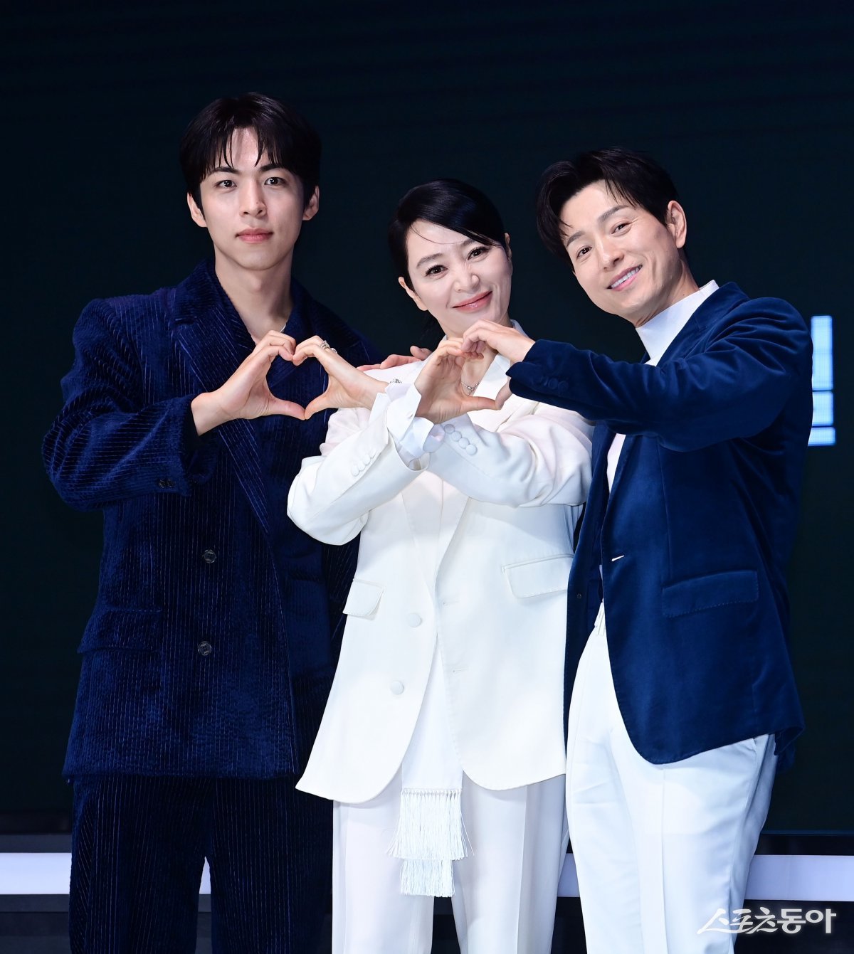 배우 주종혁, 김혜수, 정성일이 8일 서울 영등포구 여의도동 콘래드서울에서 열린 디즈니플러스 ‘트리거’ 제작발표회에서 포즈를 취하고 있다. 주현희 기자 teth1147@donga.com