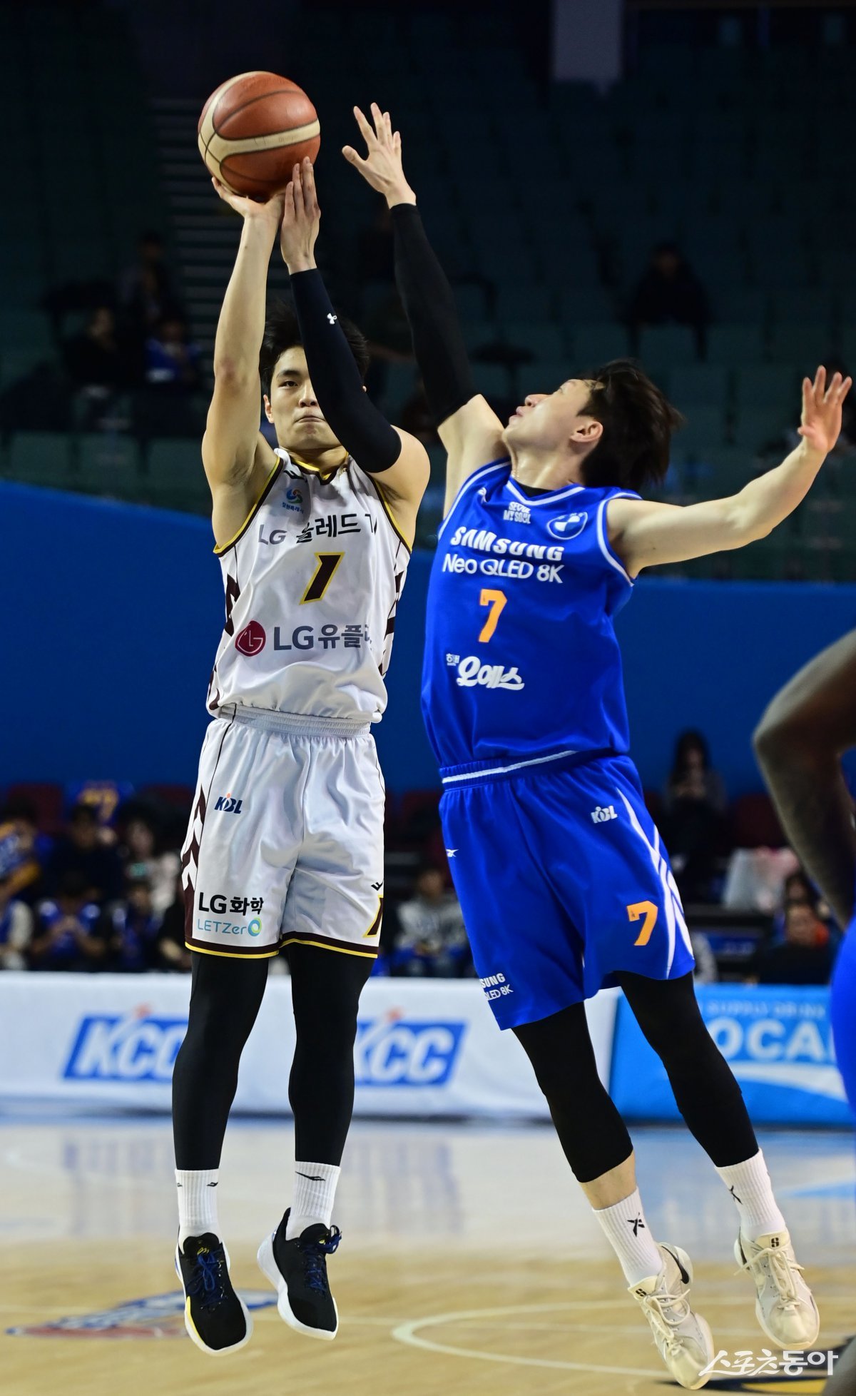 9일 서울 잠실실내체육관에서 열린 ‘2024-2025 KCC 프로농구’ 서울 삼성과 창원 LG의 경기에서 LG 유기상의 삼성 최성모의 앞에서 슛을 하고 있다. 잠실 | 주현희 기자 teth1147@donga.com