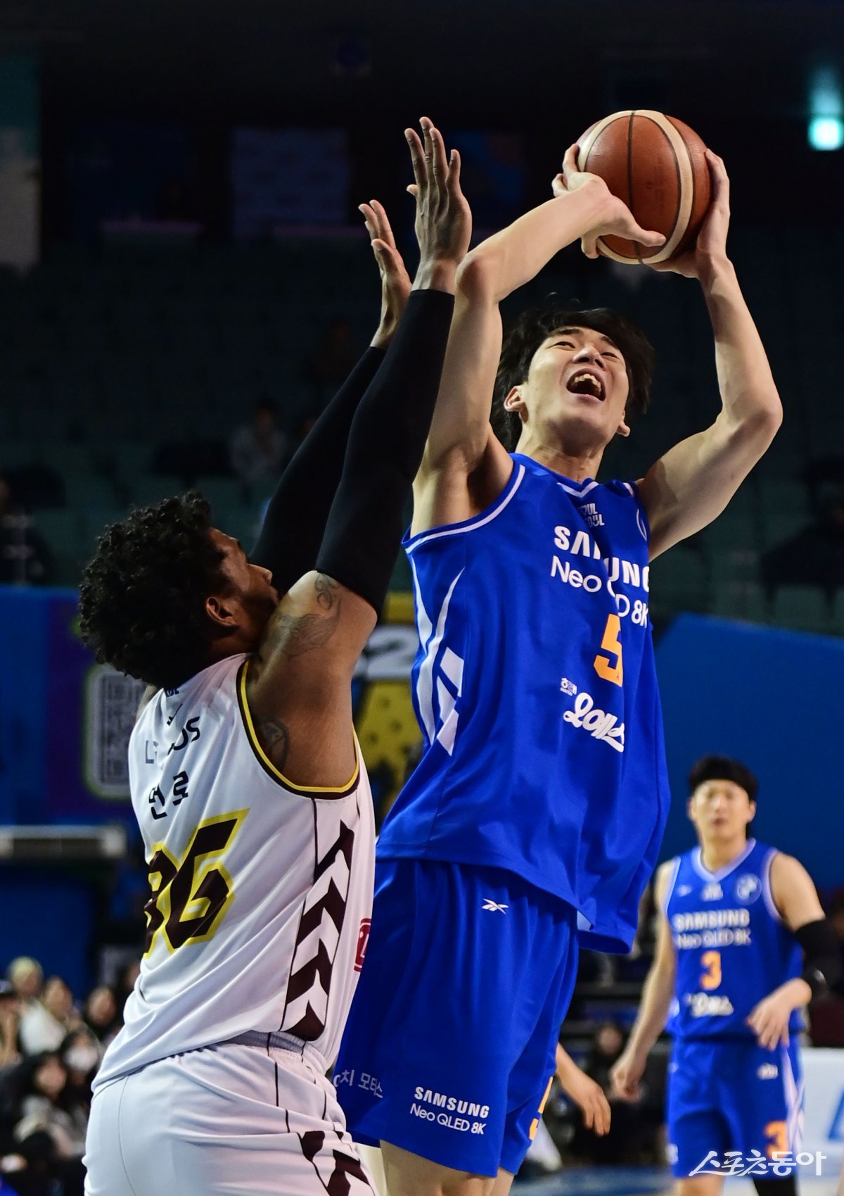 9일 서울 잠실실내체육관에서 열린 ‘2024-2025 KCC 프로농구’ 서울 삼성과 창원 LG의 경기에서 삼성 이원석이 LG 수비 앞에서 슛을 하고 있다. 잠실 | 주현희 기자 teth1147@donga.com