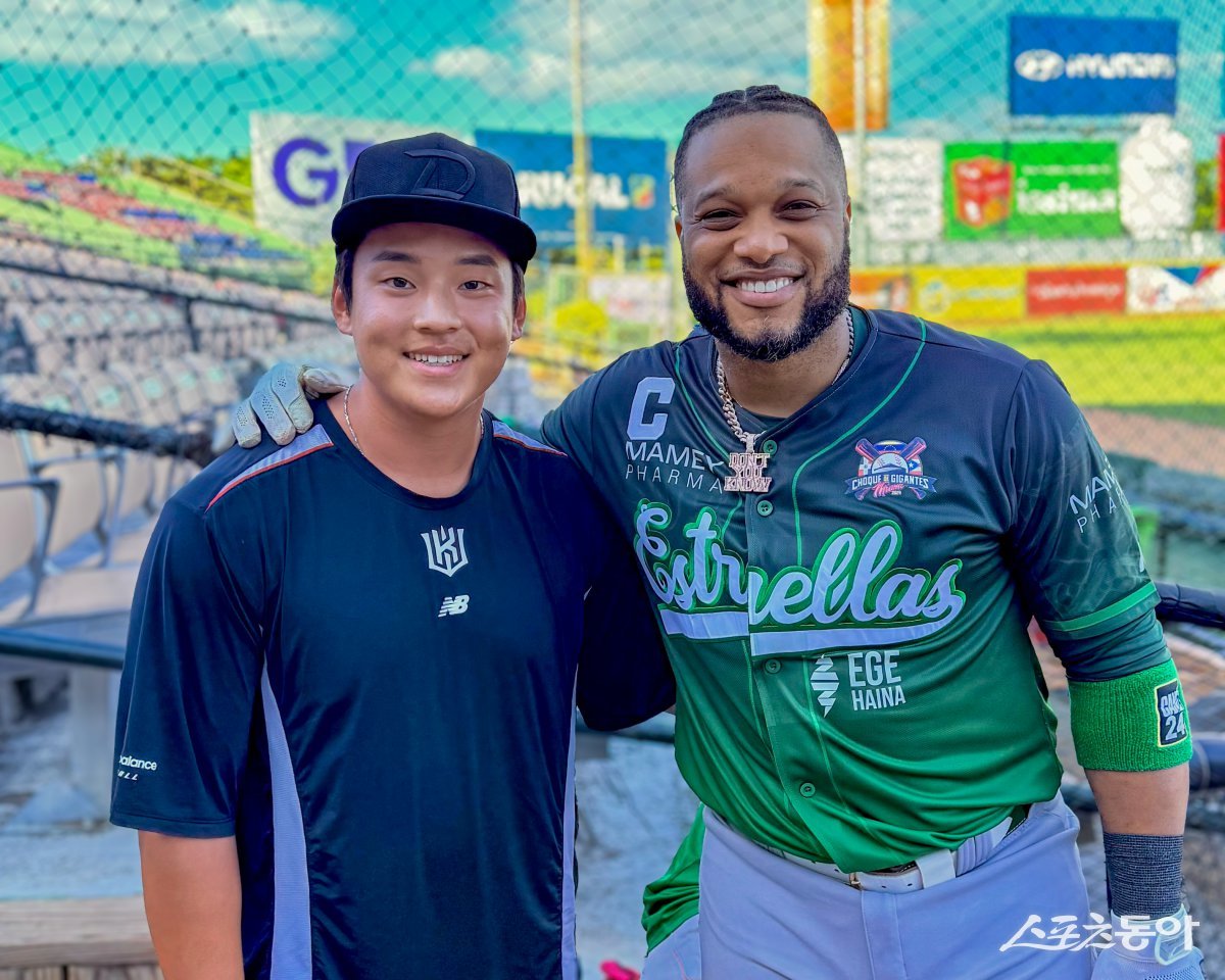 지난달부터 도미니카공화국에서 훈련하고 있는 KT 강민성(왼쪽)이 도미니카 윈터리그에서 뛰는 로빈슨 카노와 밝게 웃고 있다. 사진제공|강민성