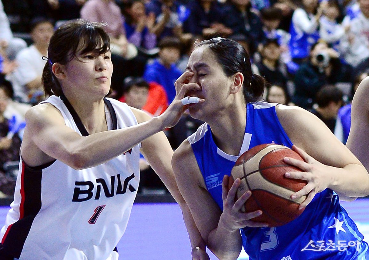 12일 충남 아산이순신체육관에서 열린 ‘하나은행 2024-2025 여자프로농구’ 아산 우리은행과 부산 BNK썸의 경기에서 우리은행 한엄지가 BNK썸 변소정의 반칙을 얻어내고 있다. 아산 | 김민성 기자 marineboy@donga.com